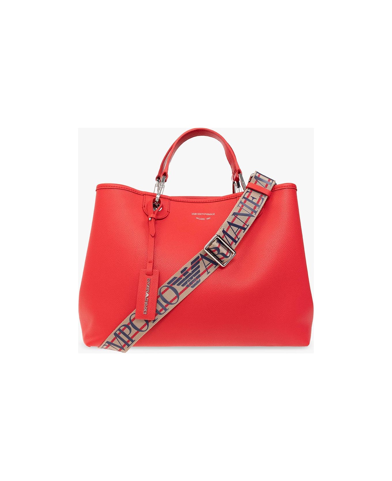 Red 'MyEA Medium' shopper bag from Emporio Armani. Crafted from faux grained leather, this design features a snap fastening, a logo print on the front, two detachable handles, an adjustable shoulder strap with a logo, an attached pendant including a metal