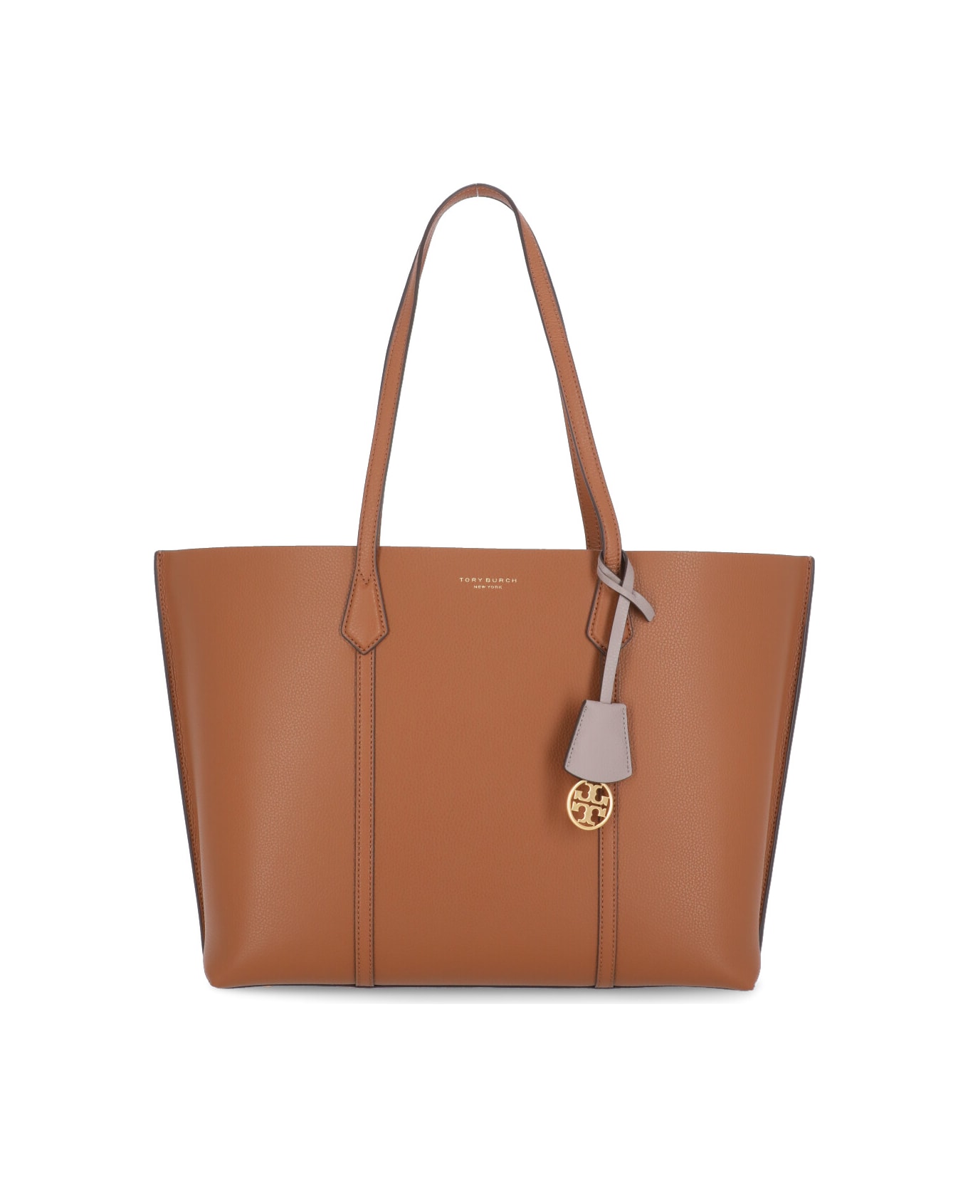 - Brown Tory Burch pebbled leather shoulder bag for woman - Two handles - Removible metallic double T logo - Two main contrasting colour compartment - Front contrasting color printed logo - One internal pocket with contrasting color fastening - Three internal welt pockets