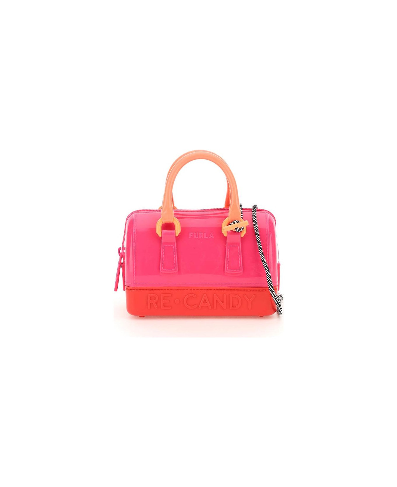 Candy mini bag by Furla crafted in recycled TPU with embossed "RE-CANDY" lettering on front and back, double top handle with tone-on-tone recycled ABS details and zip closure. Detachable trekking-like strap. Embossed lettering logo on front and on the zip puller. Unlined.