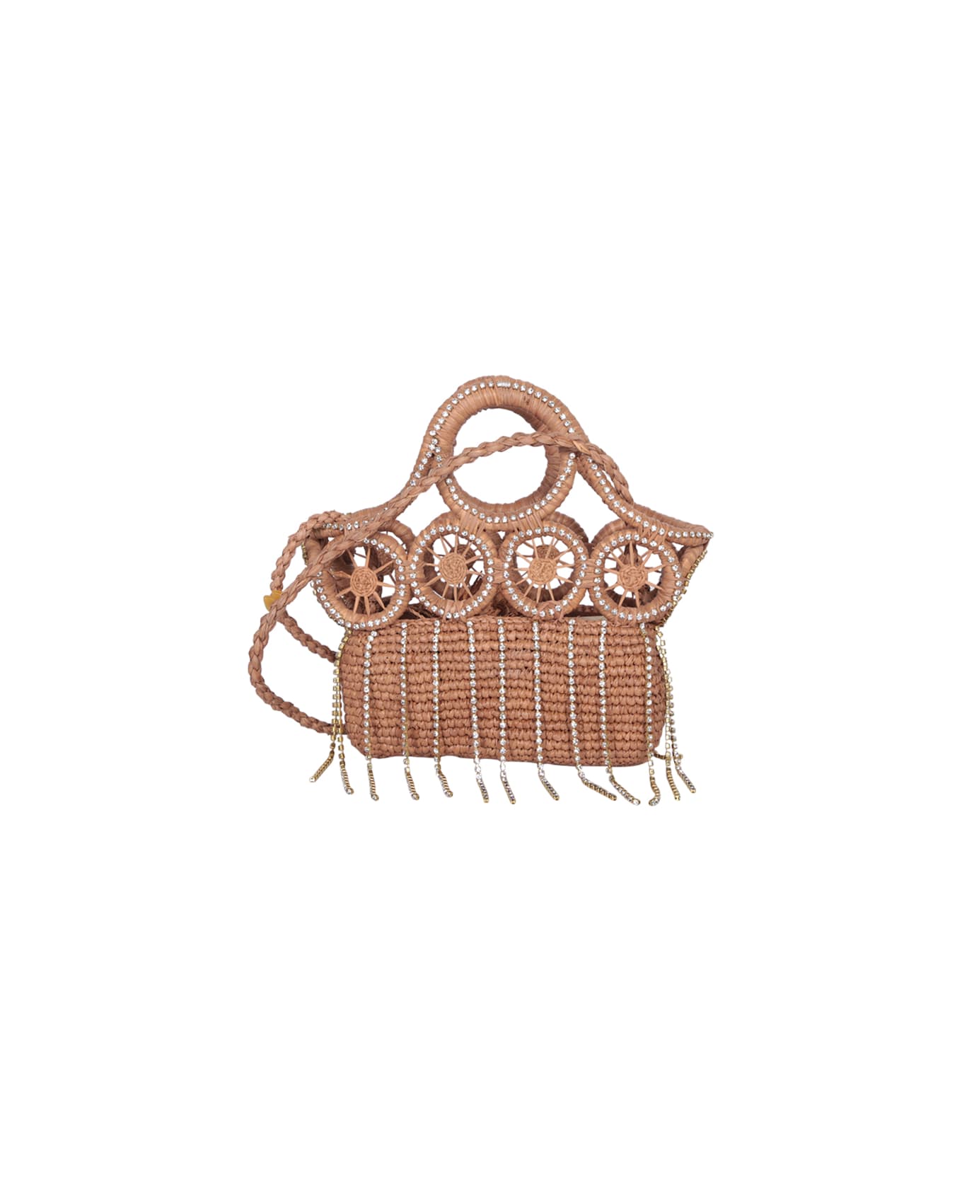 The Rija Preciosa Beige Bag by Adidas by Raf Simons features an intricate woven design with decorative circular detailing, completed with a drawstring closure and metallic pendants for an added touch of elegance.