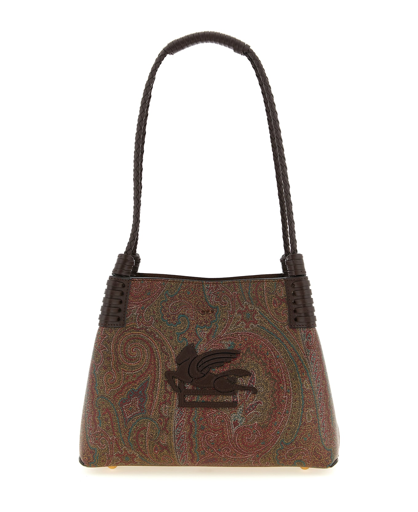 Small 'Libra' shopping bag in 'Arnica' Paisley jacquard canvas and leather, front leather 'Pegaso' logo patch, double braided fixed handle, inner carabiner closure, rigid base with metal feet, removable suede clutch bag. Composition: 76% cotton, 24% polyester
