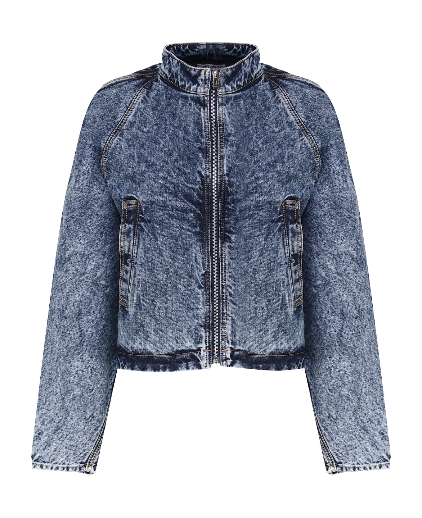 -Racing blue denim jacket by Alaia -Blue Japanese denim in cotton blend long rounded sleeves, -Front zip closure - Flat side pockets -Martingale on the back that emphasizes the waist -Contrasting stitching