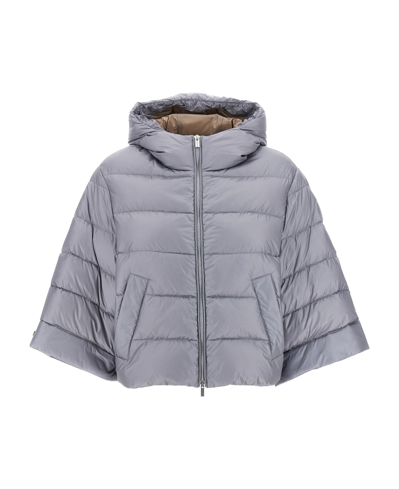 Quilted nylon down jacket with goose feather padding, crop model, hood, high neck, front zip closure with metal detail, pockets, elastic at the hem, 3/4 wide sleeves, side snap button closure to transform the garment into a cape. Composition: 100% polyamide