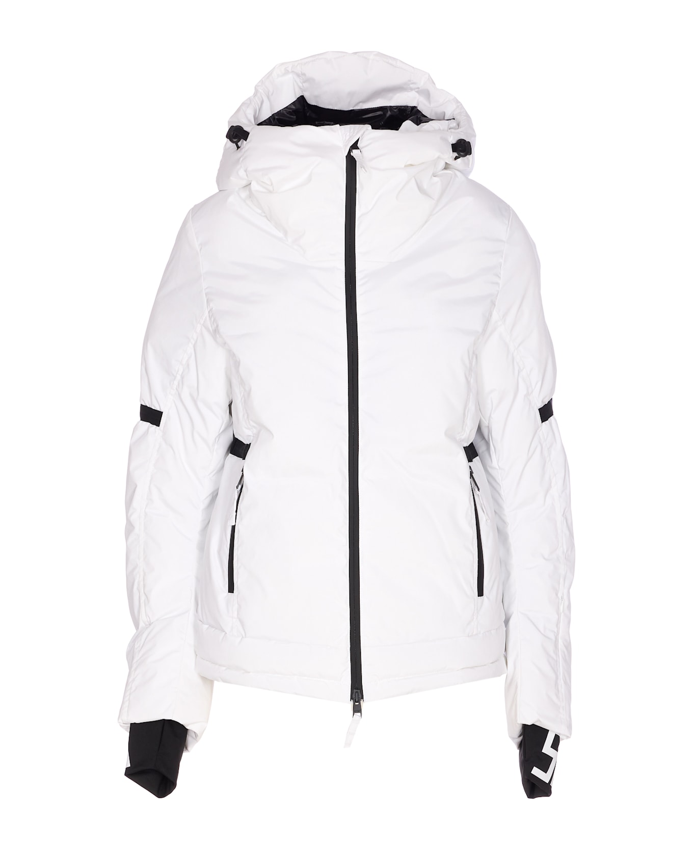 Jet Set white Joanna down jacket with frontal zip closure, long sleeves, zip pockets, hood detail, zip pocket detail on cuffs Composition: 69% Polyamide, 25% Polyurethane, 6% Elastane