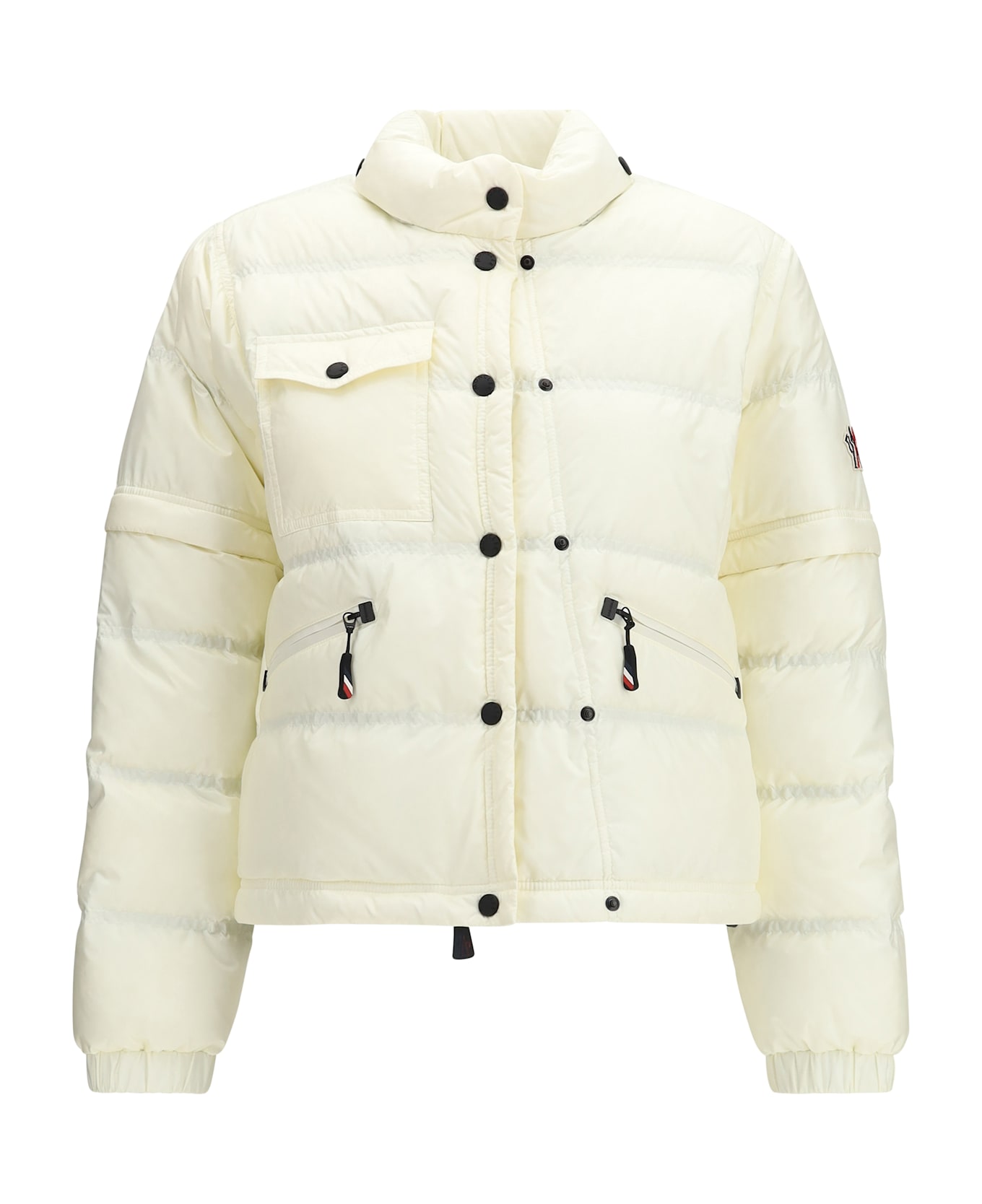 The mauduits down jacket by moncler grenoble combines technical performance with contemporary style in a compact, functional design. crafted from padded nylon, it features a cropped silhouette with a concealed hood adjustable via drawstring. the front zip fastening is complemented by a double row of buttons to adjust the shape, while front zip pockets and a flap-and-button chest pocket add practicality. long sleeves with elasticated cuffs include zip openings to convert them into short sleeves, and an internal drawstring at the hem allows for volume adjustment. the logo patch on the sleeve, light blue polyester lining, breathable back detail, and rear pocket complete the design. packable and versatile, this jacket is built for protection and adaptability in all conditions.
