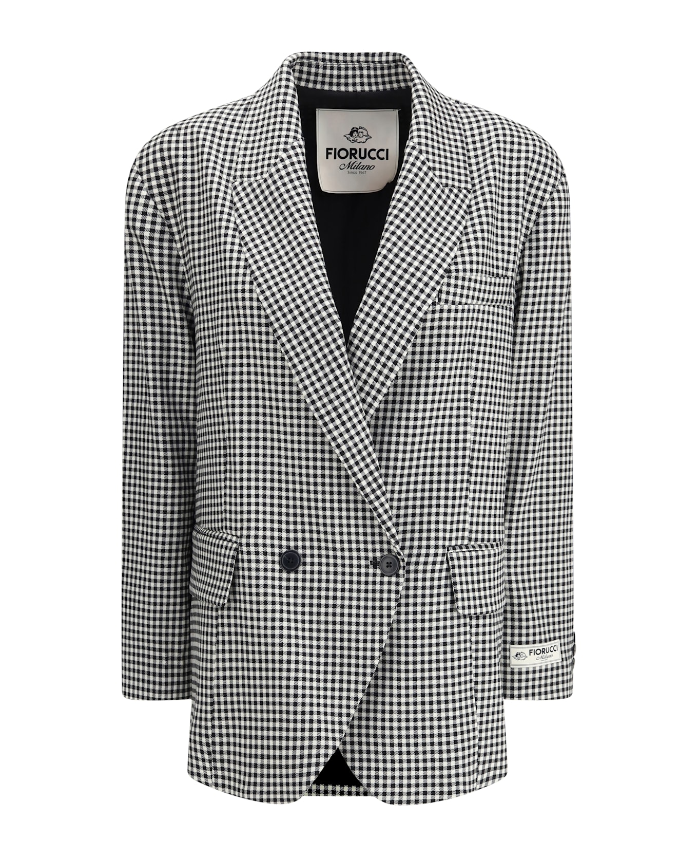 The gingham blazer by fiorucci, crafted from a virgin wool blend in black and white tones. the piece features a fiorucci logo label at the bottom of the left sleeve, front button closure, peak lapels, removable shoulder pads, long sleeves, and front pockets. designed with an oversized fit and fully lined. made in italy.