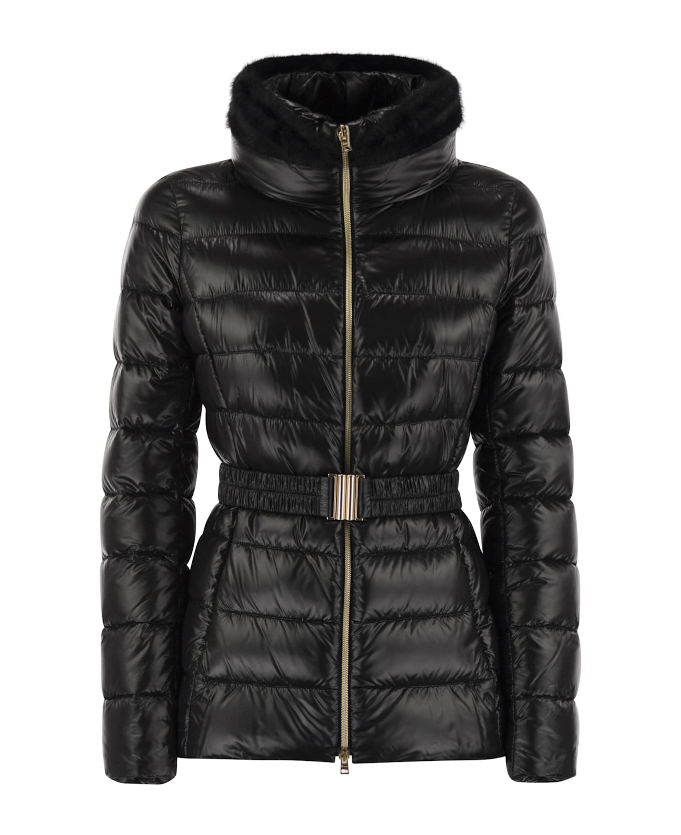 Jacket made of Herno's iconic ultralight nylon: an innovative technical fabric that combines good water resistance with a particularly luxurious silk-like feel. The model features a slim design with a high collar finished in faux fur and an elastic waistband that enhances the silhouette. The garment's proportions are designed to follow your movements and ensure an impeccable fit, while the fine down filling is soft, light and retains warmth. - Slim fit - High collar - Faux fur trim - Long sleeves - Two-way zip fastening - Elastic belt with metal buckle - Pockets with invisible zip - Padded with down - Performance: Water-repellent treatment DESIGNER ID: PI0485DICM0512017Z 9300