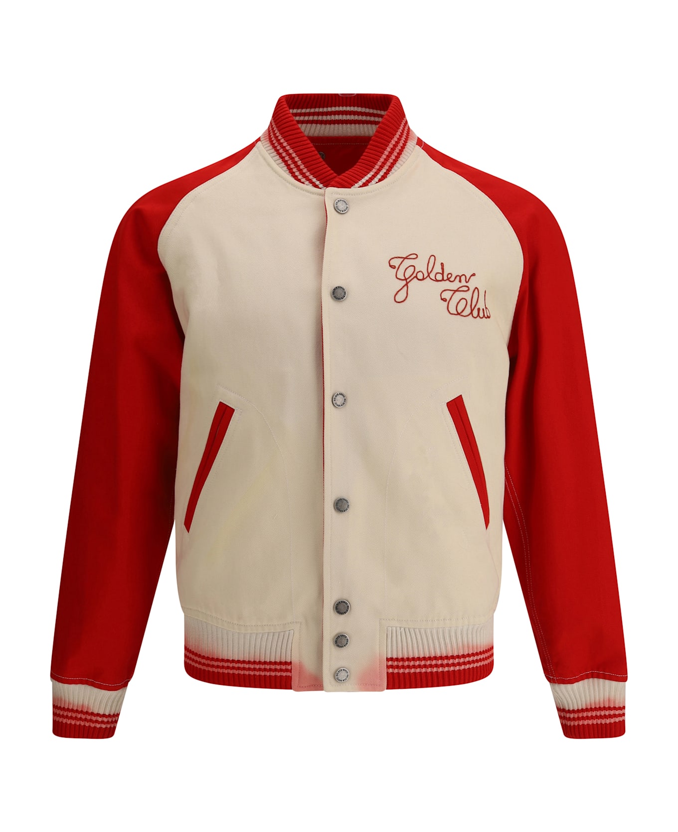 Golden goose's embroidered bomber jacket is a sporty and stylish piece that combines comfort with distinctive details. with a ribbed plush collar, hem and cuffs, it provides a comfortable and casual fit. the front snap button closure and two side welt pockets add functionality to the design. the iconic embroidered logo on the front and back lends an exclusive and recognizable touch, making this jacket perfect for an urban, edgy look.