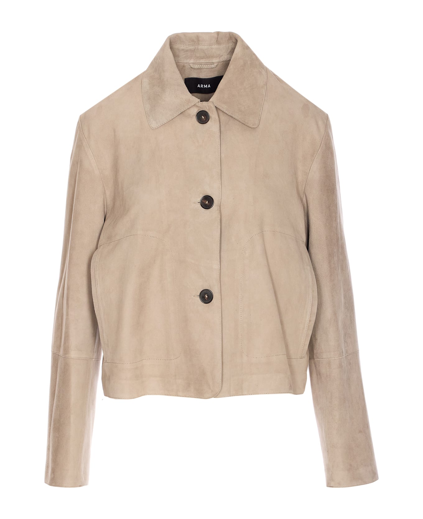 Arma grey Emy suede jacket, buttons closure, regular collar, long slevees, lateral pockets