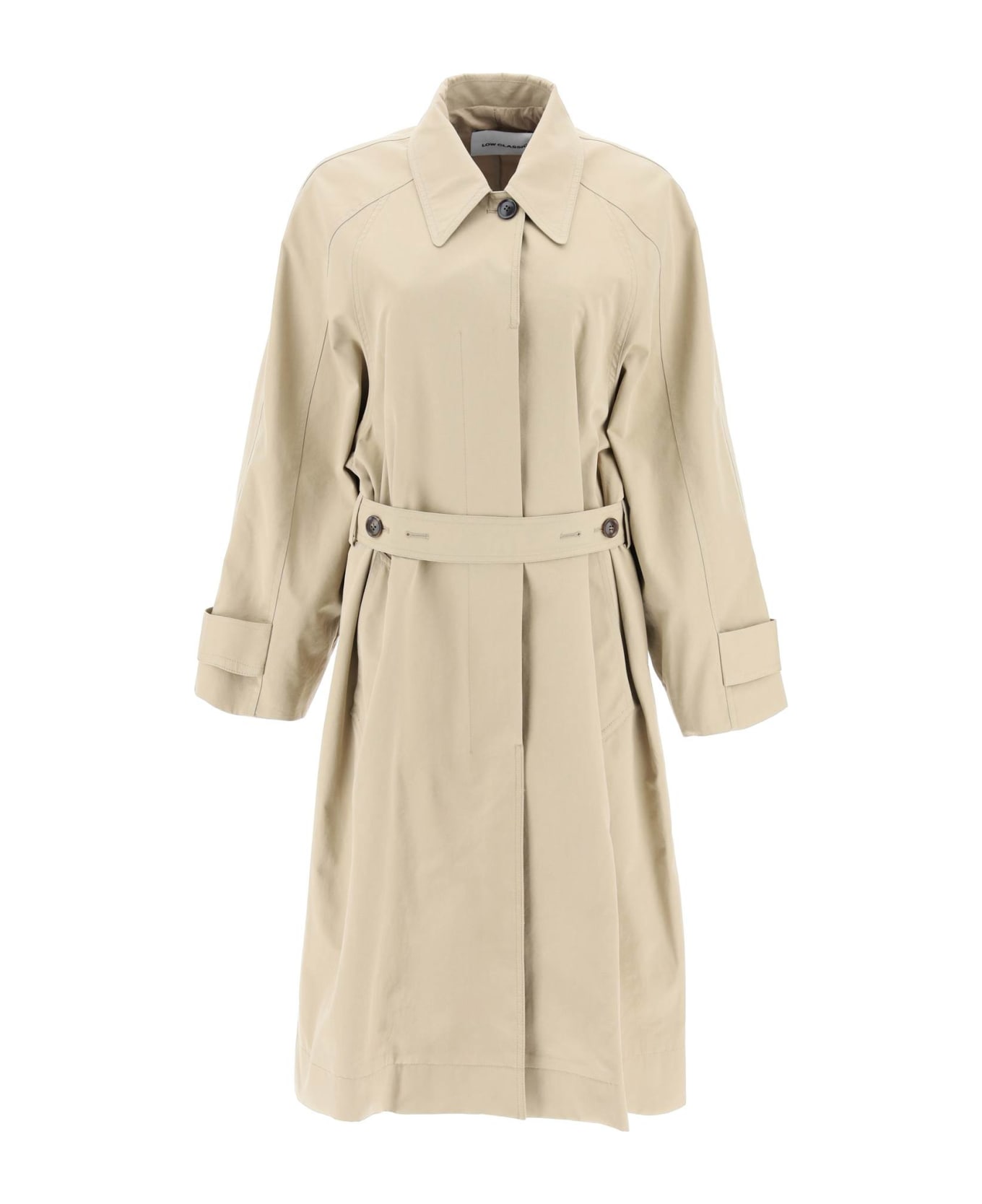 Long trench coat in technical cotton by Low Classic, with hidden button placket and wide armholes. Pointed collar, welt pockets, cuff straps, back vent, belt with buttons to be tied on the back. Semi-lined. The model is 177 cm tall and wears a size XS.