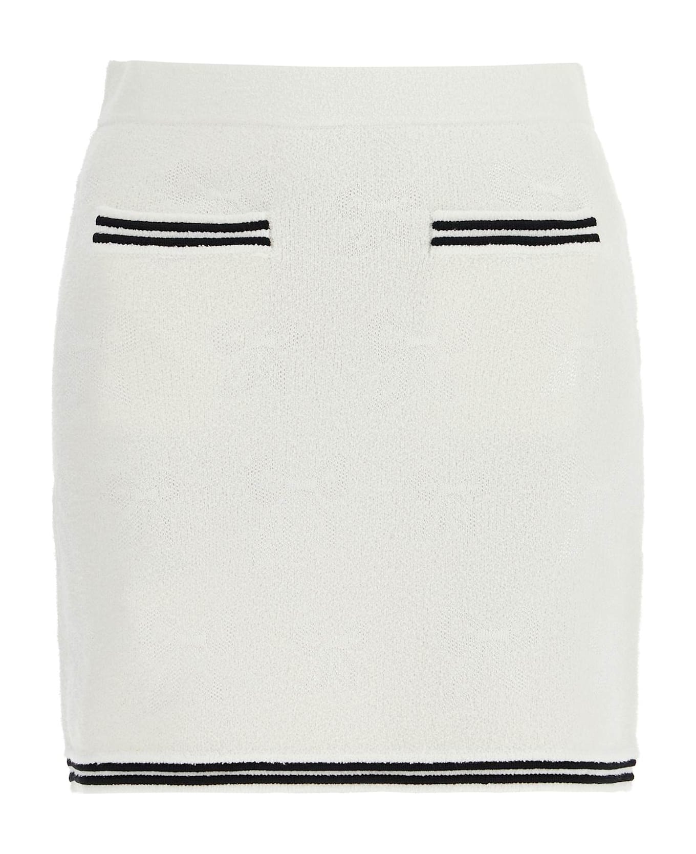 The Self Portrait miniskirt is made of bouclé cotton blend, embellished with the iconic bow in a jacquard pattern. The finishing touches include contrasting hems and two front pockets. The model is 177 cm tall and wears size S.