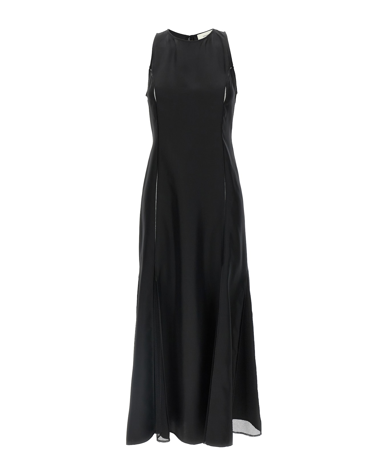 'Iraka' silk twill midi dress with lace stitch inserts, flared skirt with mesh tulle inserts, round neckline, sleeveless, back zip closure.