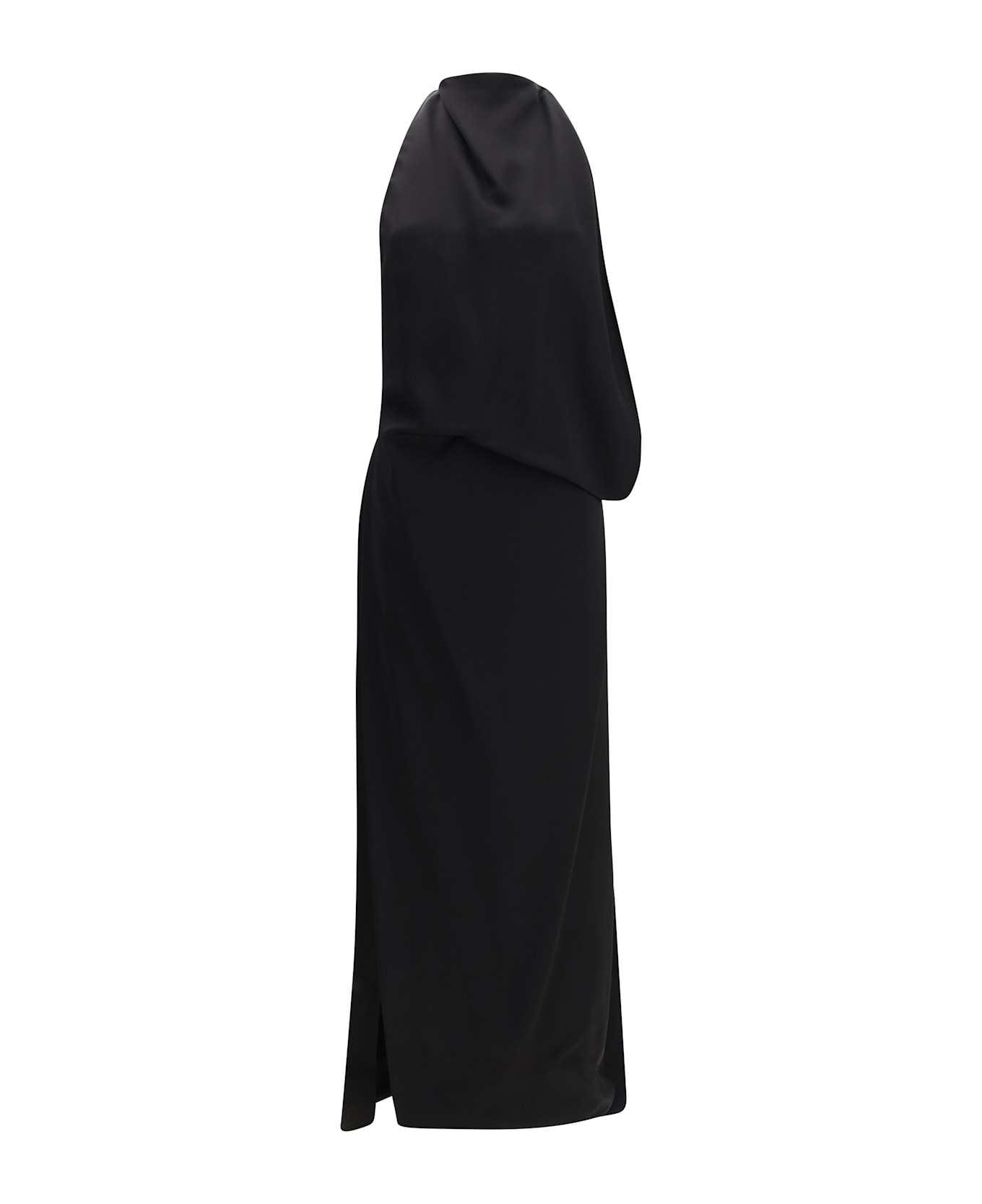 The long dolmen dress by max mara sportmax stands out for a feminine silhouette that combines sensuality with contemporary construction. the dolmen model by sportmax features bare shoulders and a halter neckline that enhances the line of the bodice, while a racerback detail on the back defines the structure of the garment. the straight skirt is paired with wide side slits that introduce movement and length to the silhouette. the hem with an asymmetrical length completes the design with a dynamic and modern detail.