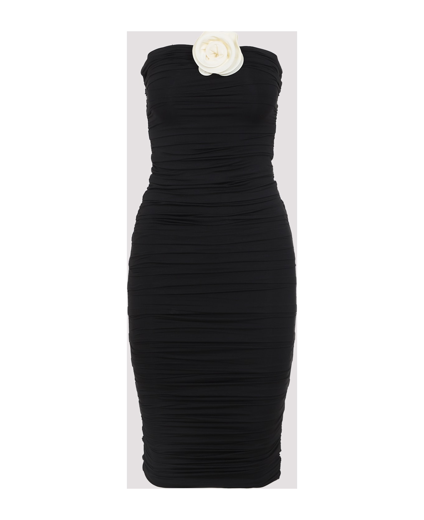 La Reveche Black Mirey Long Dress. Crafted in polyamide and elastane blend. Strapless dress, front contrasting ivory white flower design, midi-length, straight hem, draped effect all-over.