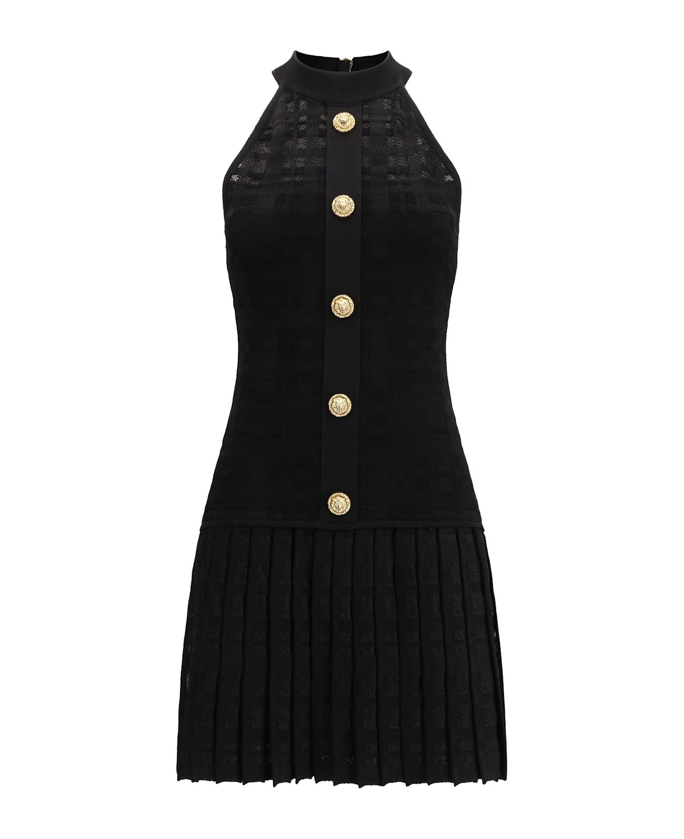The pleated mini dress by balmain features a sleeveless design with an elegant halter neckline. the front closure with embossed buttons and pleated skirt add a touch of sophistication, while the tone-on-tone check print gives it a refined and modern look. the zipper at the back ensures a perfect fit, making this dress ideal for elegant events and special occasions.