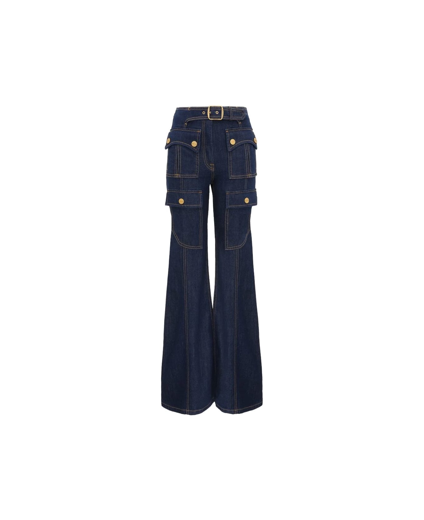 blue, sewn in waist-belt, gold-tone hardware, front flap pockets.