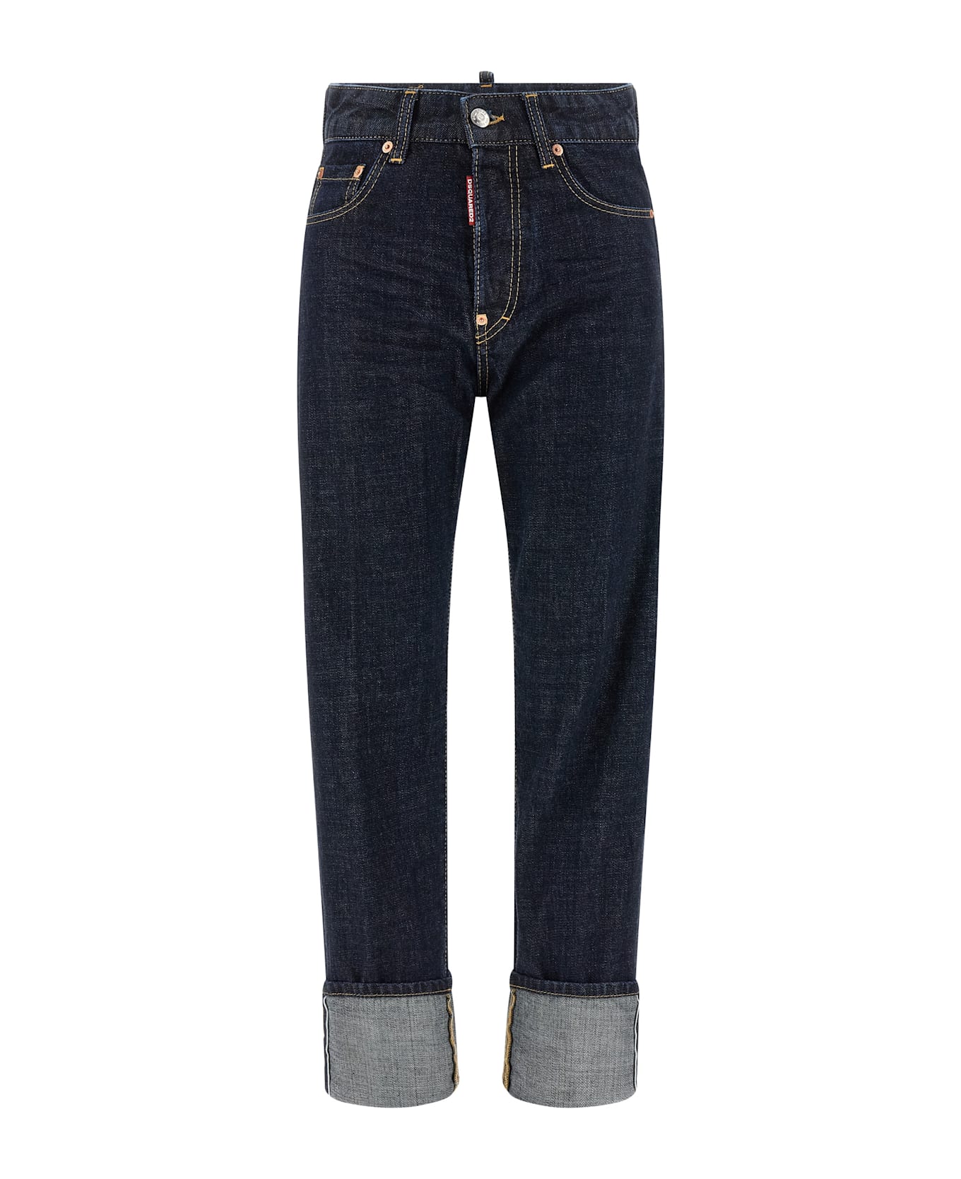 13-ounce Japanese selvedge cotton denim Tomboy jeans with contrast stitching, low waist, front button closure, five pockets, straight leg, turned-up hem, and back leather logo tag.