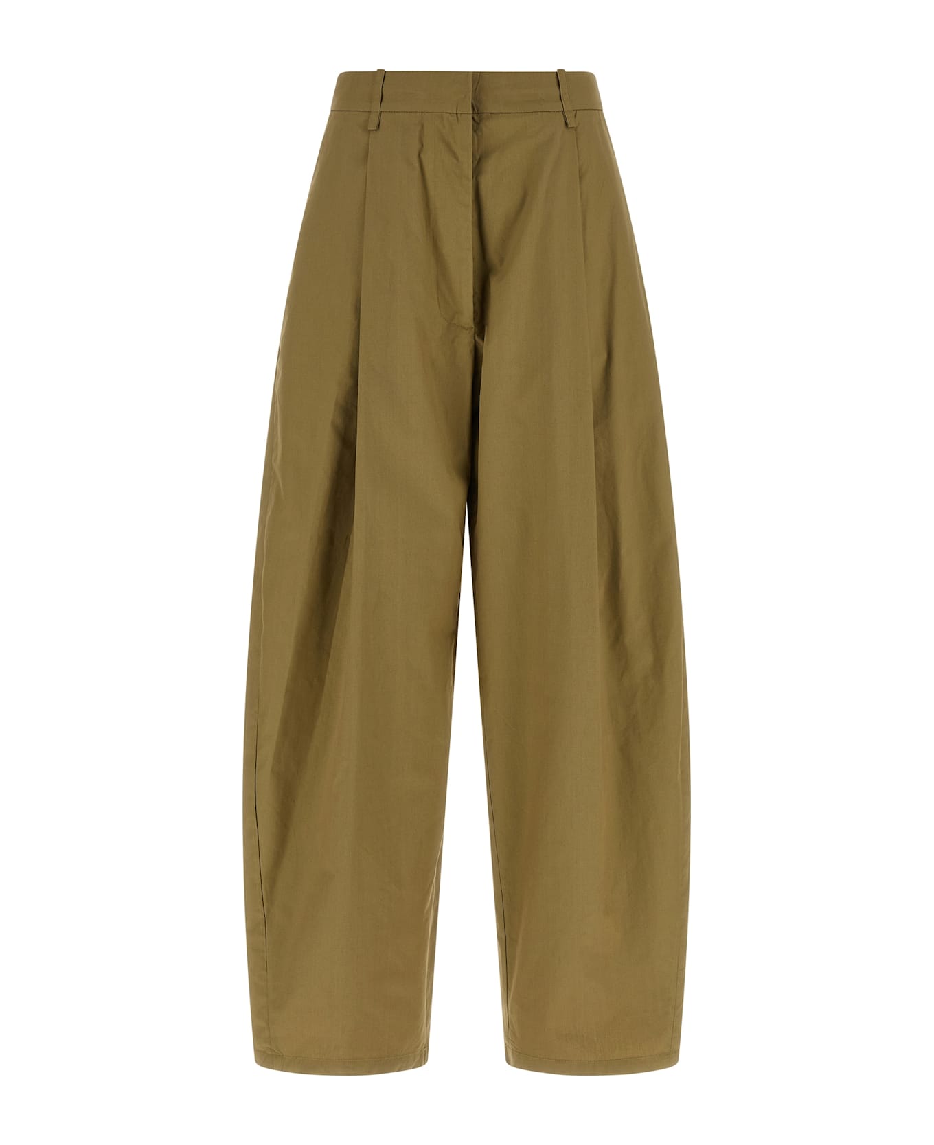 Cotton poplin pants, extra wide and curved leg, pins, hook and front button zip closure, front American pockets, back welt pockets. Composition: 100% cotton