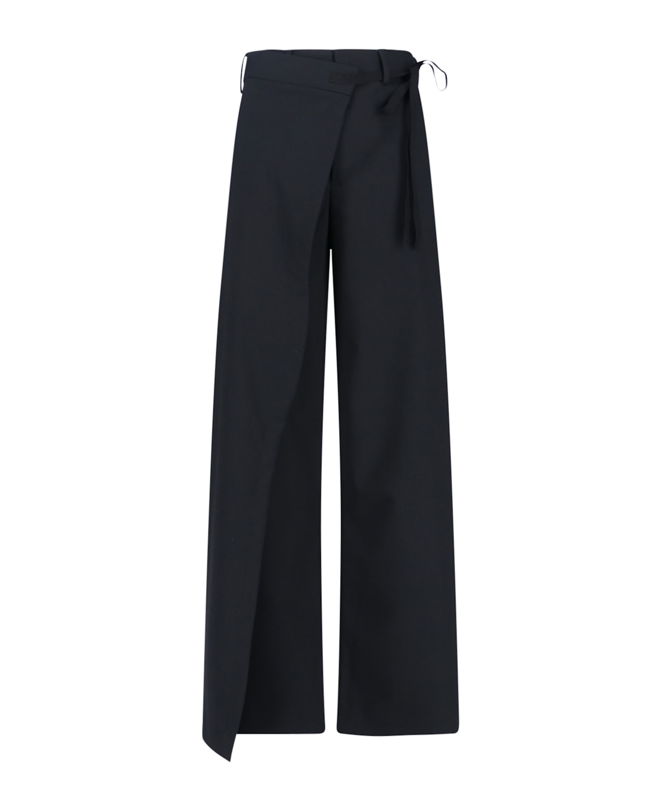 Maison Margiela MM6 tailored trousers in black fabric with front zip and hook closure, belt loops, front fastening detail, back welt pocket, contrasting stitching at the back, straight leg.