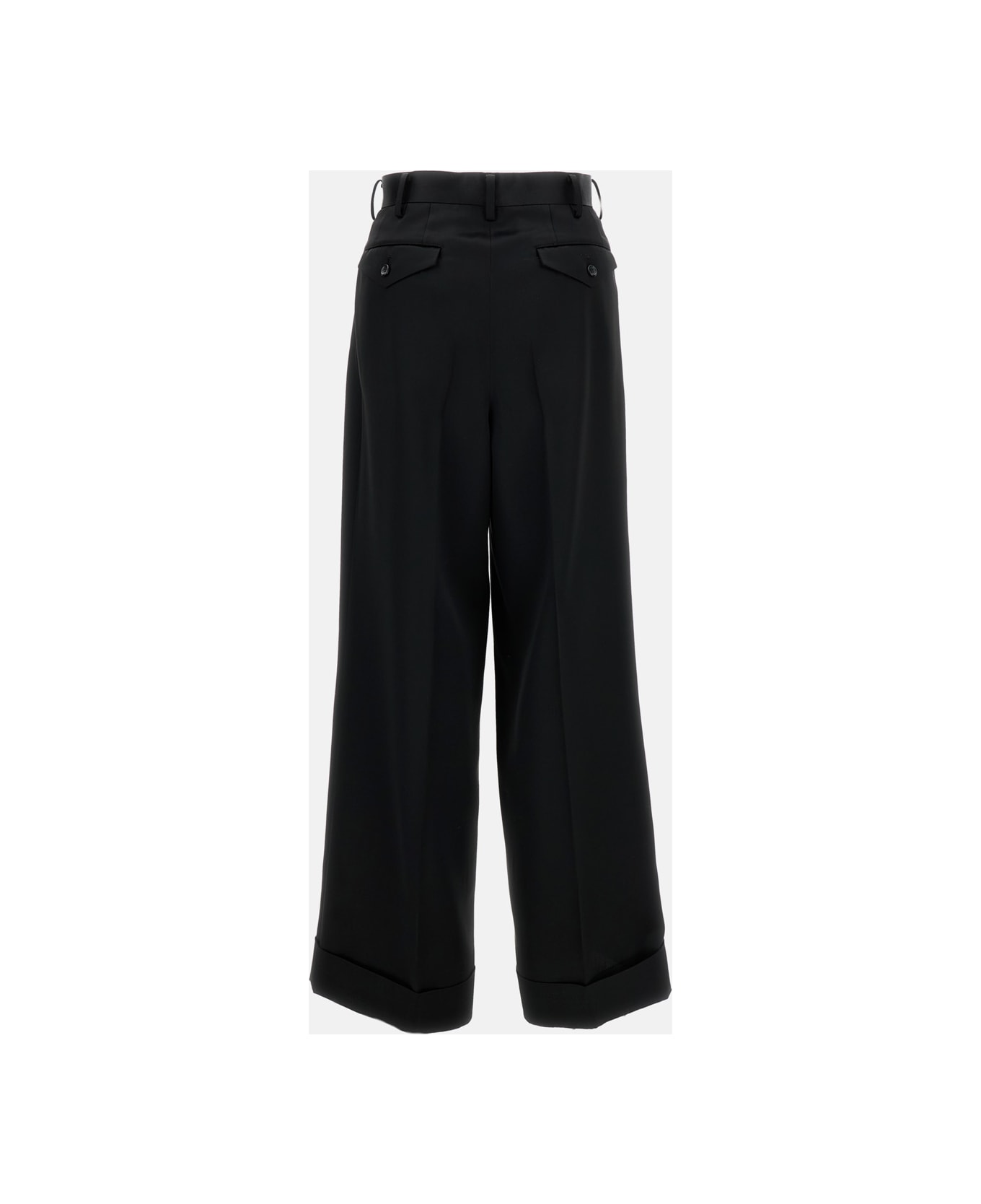 Tailored trousers with front pleats Fluid fabric, wide leg Turned-up hem Front fastening with hidden zip and hook-and-eye Waist belt loops Side welt pockets Color: black