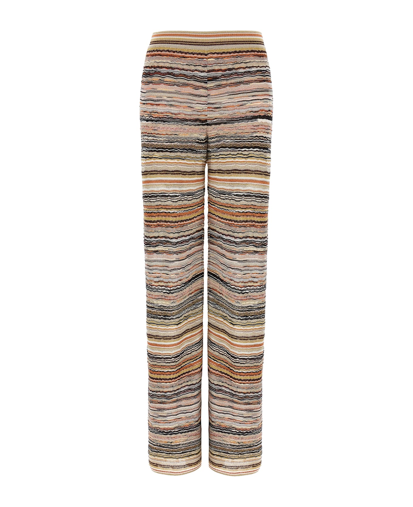 Lamé embossed viscose trousers crochet with striped wave pattern, elastic waistband, straight leg, inner culottes.