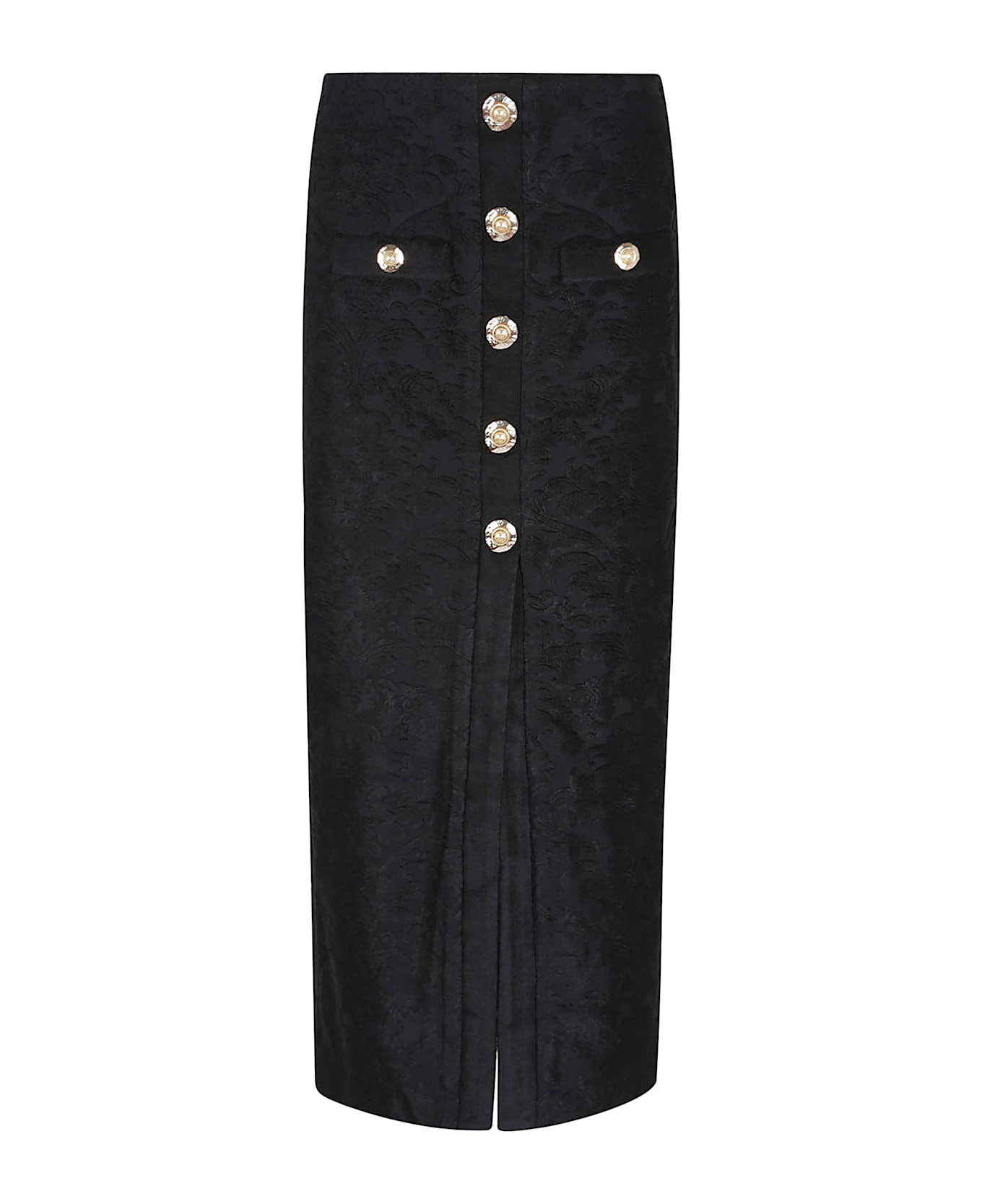 Baroque bouclette skirt with jersey lining by BALMAIN. Exposed gold-tone metal zip closure at the back; fitted midi design with a front slit. Featuring five decorative buttons at the front and two trompe-l`oeil pockets with two decorative buttons, "Gold" and "Gold Coin" buttons.