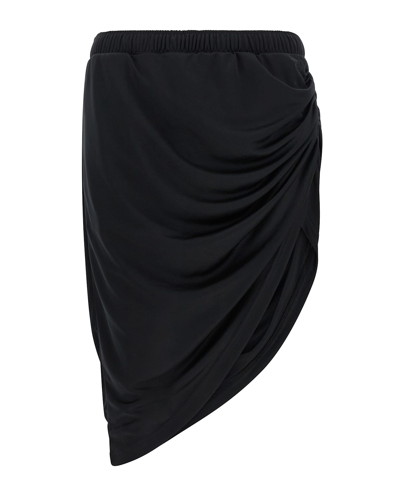 'Twist Sport' stretch jersey mini skirt, unlined, tone-on-tone logo patch on the front, slightly elastic curl on the left side, drawstring elastic waistband, pocket, asymmetrical hem.