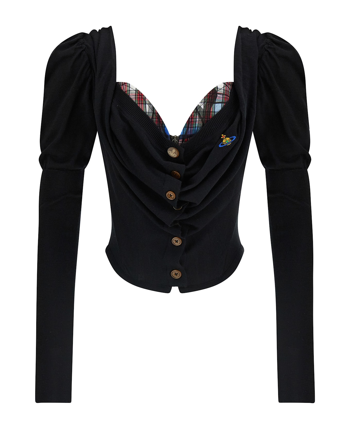 'Bea Corset' consisting of structured corset in 'Heather Tartan' fabric with sweetheart neckline, inner cues and front zip closure and overlapping cardigan in silk and light wool blend with Orb logo embroidery and front button closure, long sleeves with puff shoulder, wide back square neckline, crop model.