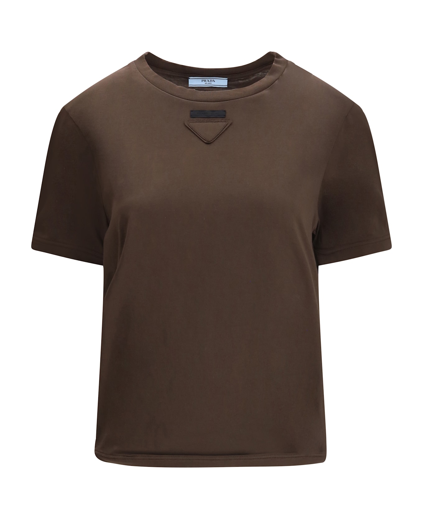 The cotton-jersey t-shirt by prada reimagines a classic through a transformable design that allows multiple styling possibilities. the boxy silhouette pairs with a clean crew neck, while the adjustable neckline, sleeves and hem let the shape shift freely. the fabric triangle logo with tailored label adds prada s subtle yet unmistakable signature. the t-shirt blends innovation, versatility and expressive freedom by prada.