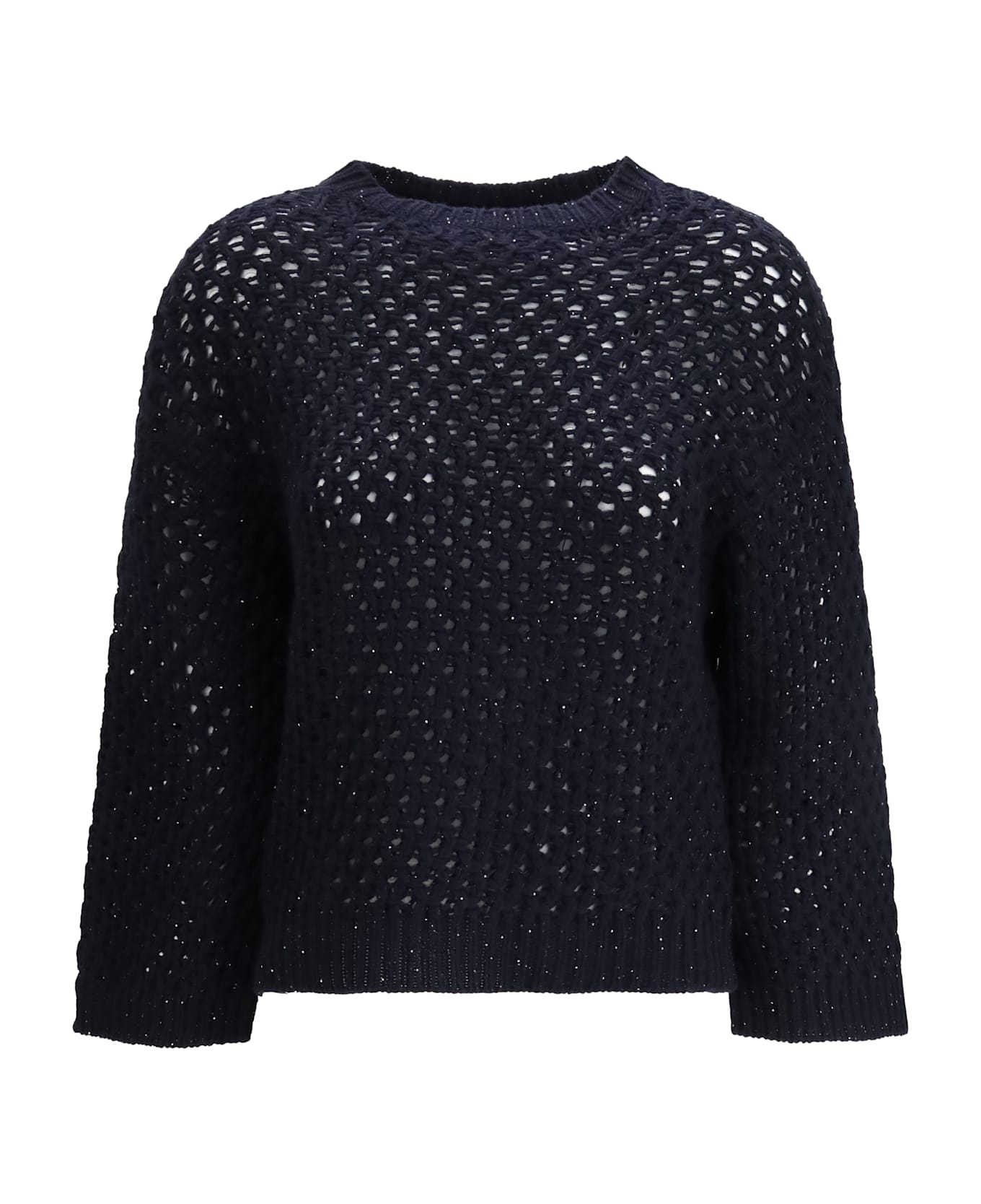 The jumper by fabiana filippi, crafted from platinum yarn with micro sequins, blends softness, luminosity and understated elegance in a contemporary design. the crew neck and honeycomb knit texture enhance the structure of the piece, creating a refined and subtly three-dimensional effect. made entirely in italy through sustainable processes, it adds radiance and femininity while keeping a clean, sophisticated aesthetic.