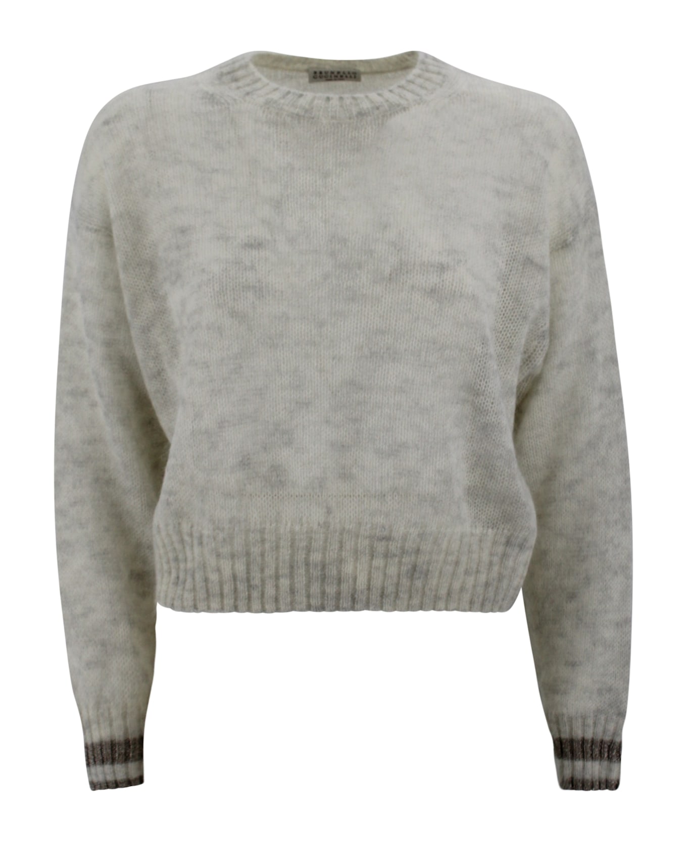 Drop shoulders and wide sleeves. Balloon sleeves. Smooth knit. The addition of a lamé thread brightens up the two-tone insert on the cuffs, for a sporty yet refined touch. Composition: 50% Mohair, 36% Poliammide, 14% Wool