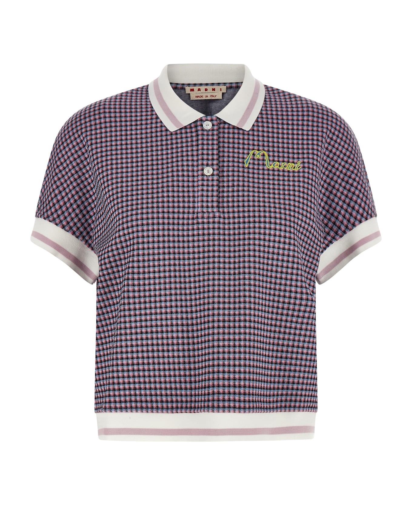 Check patterned viscose blend polo shirt with contrasting ribbed stretch knit details, slightly cropped style, collar and buttons, short sleeves with cuffs, and band on the hem. Composition: 65% viscose 32% polyamide 3% elastane
