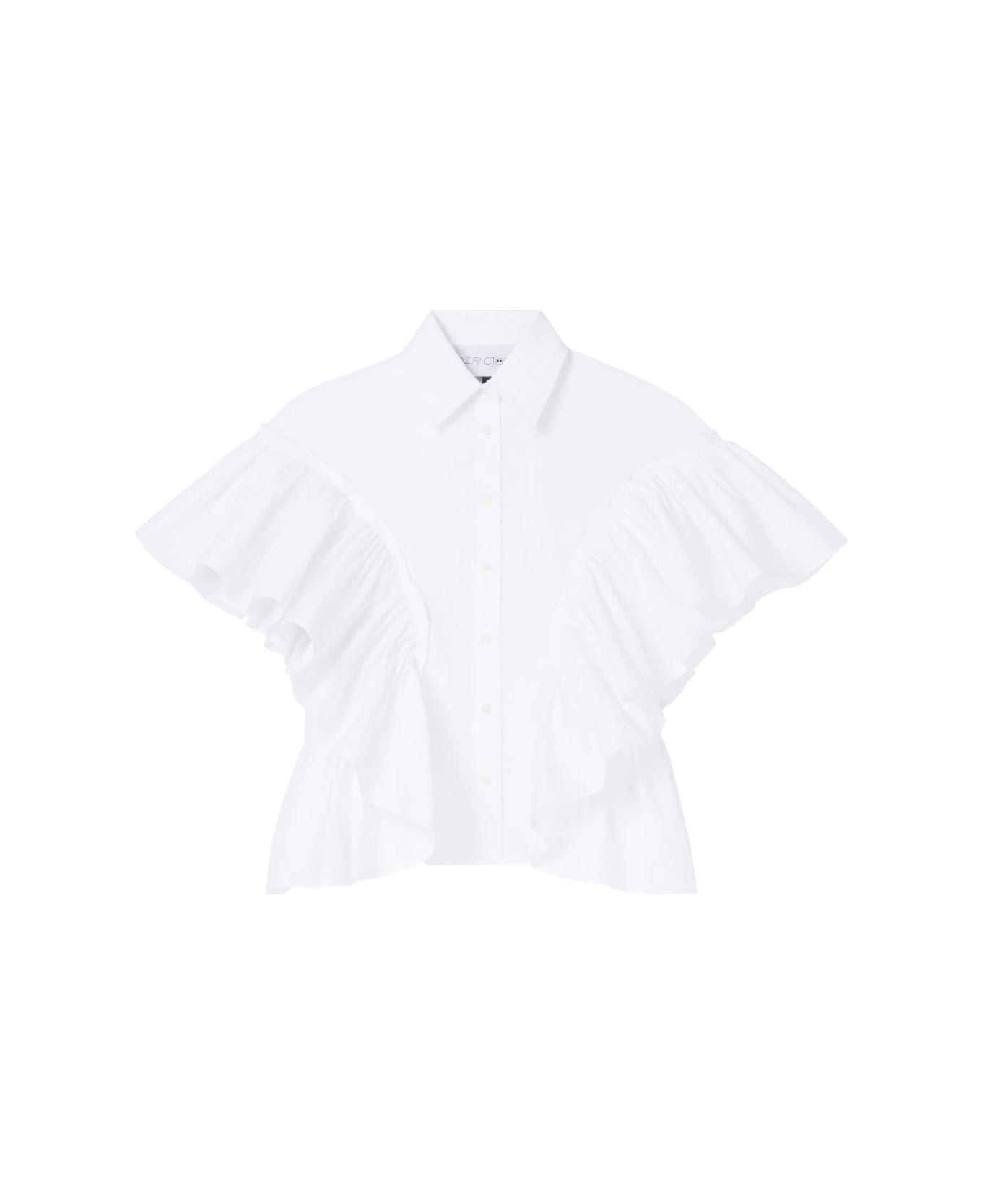 Waterfall ruffle-sleeve cotton shirt from AZ FACTORY featuring white, cotton, poplin texture, classic collar, short sleeves, front button fastening, ruffle cuffs and curved hem.