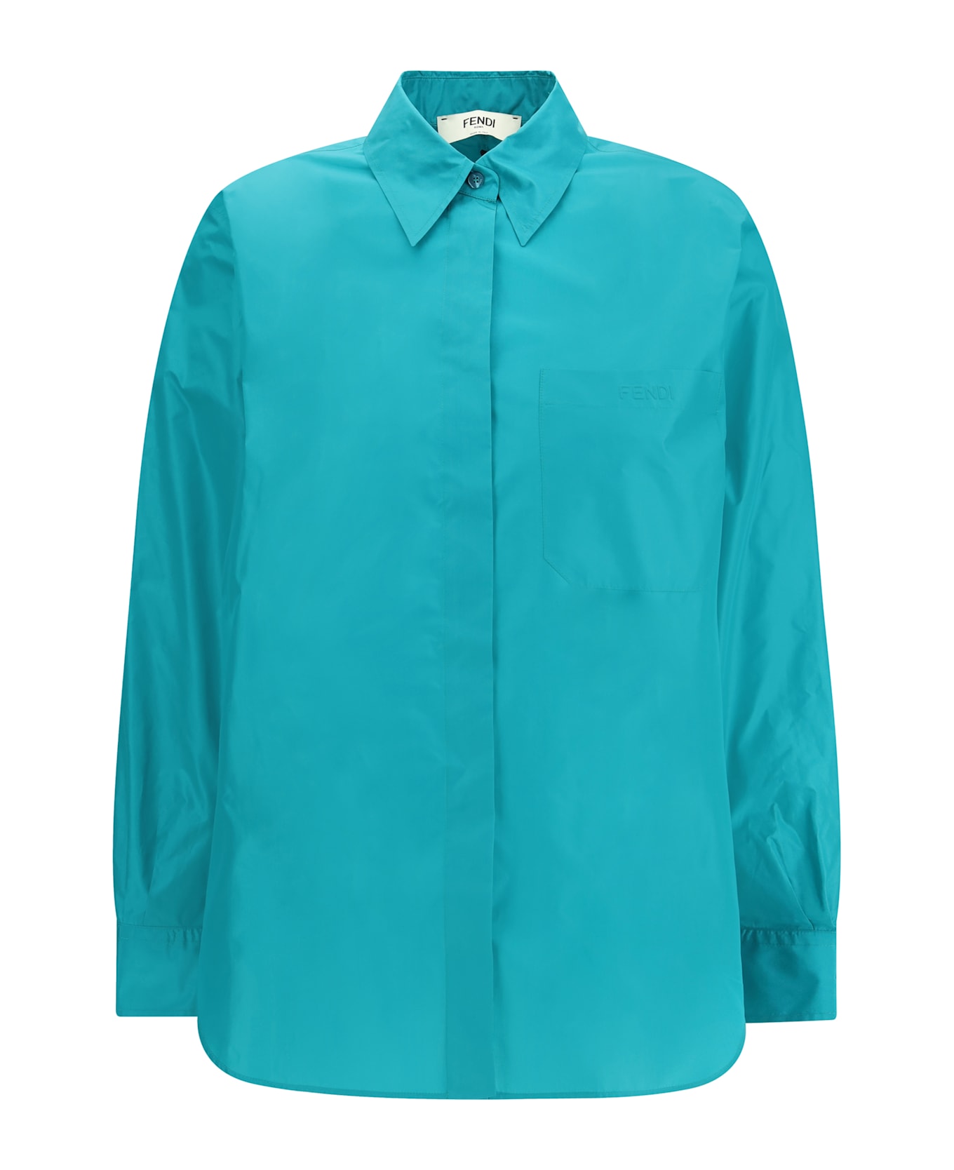 The silk taffeta shirt by fendi features an oversized volume that elevates the classic silhouette with modern elegance. the long sleeves with dropped shoulders and shirt cuffs enhance its relaxed line, while the asymmetrical rounded hem adds fluidity to the design. the hidden button closure keeps the look clean and refined. crafted from light blue silk taffeta, it is a delicate, luxurious piece with a distinctive character.