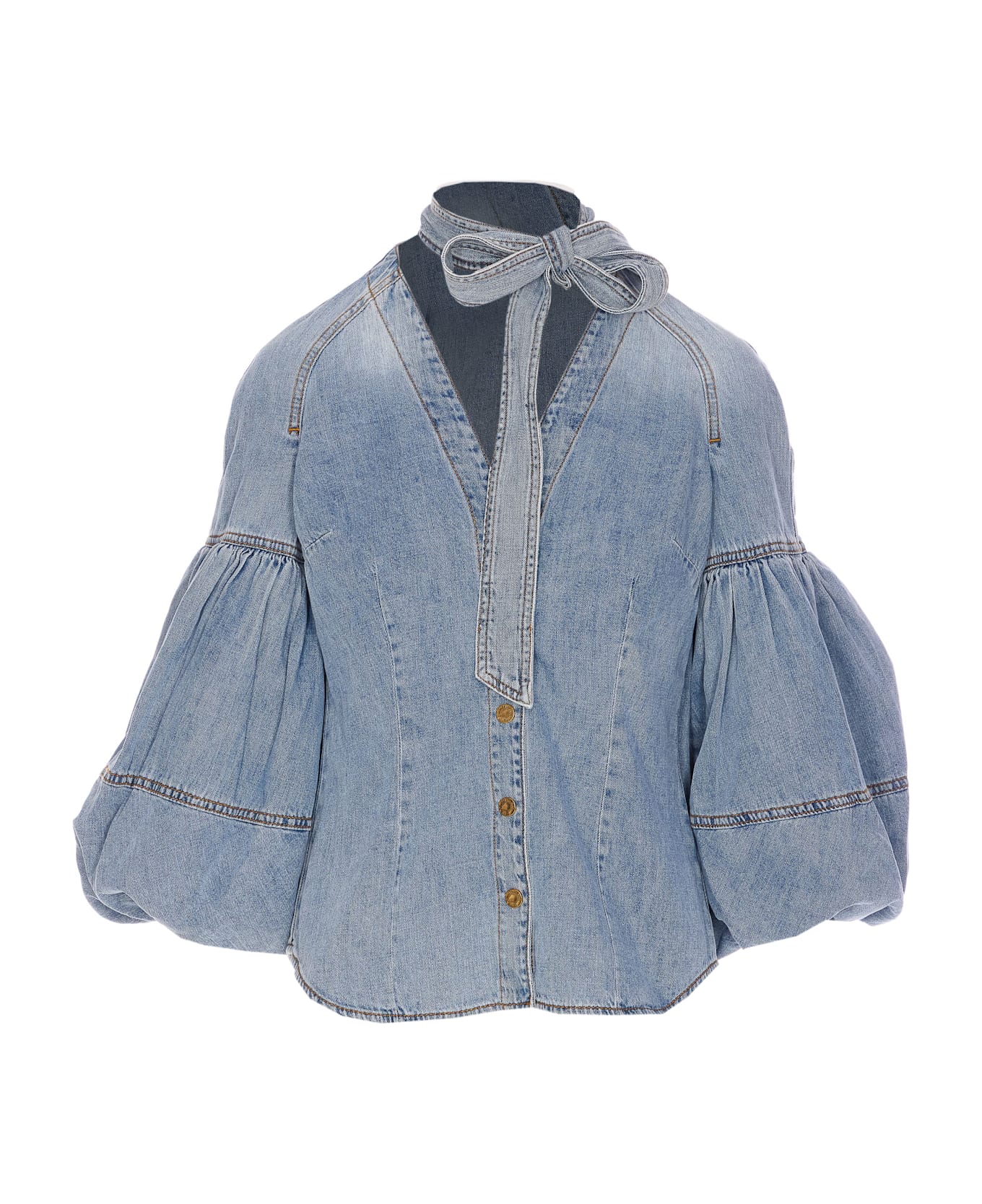 Zimmermann denim tied laces denim shirt, bow detail on collar, balloon detail, buttons closure on the front Composition: 100% Cotton, 86% Polyester, 14% Cotton