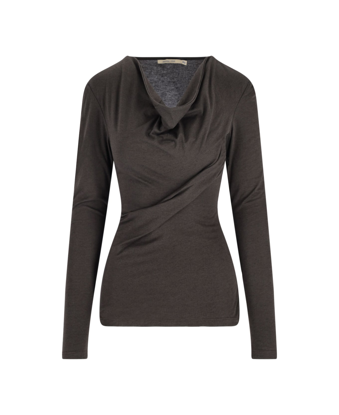 Paloma Wool "Junco" top in brown lyocell blend with long sleeves, trapped neckline, front draping detail, straight hem.