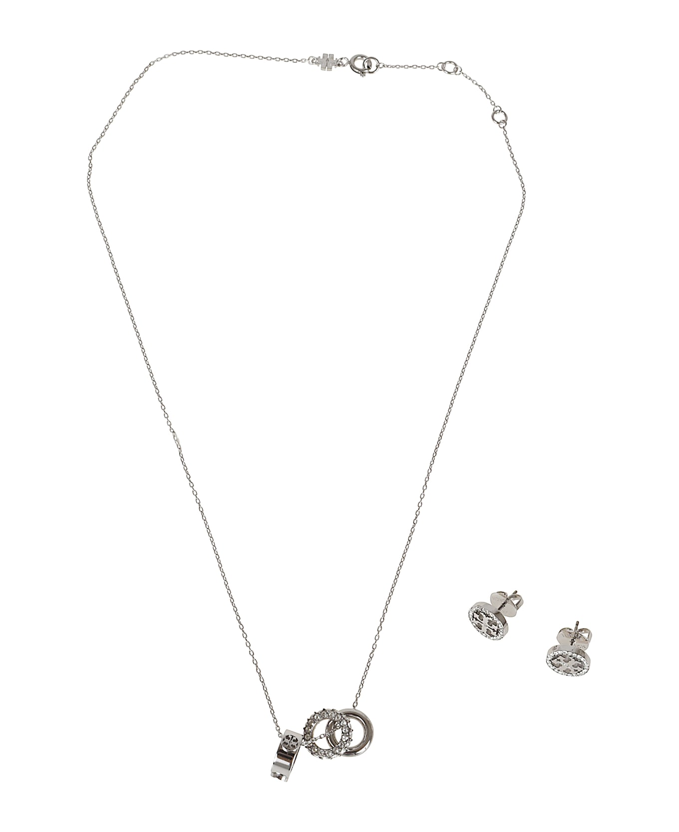 Set consisting of a stainless steel necklace and earrings, crystal by TORY BURCH. Necklace: three asymmetrical links, spring ring closure; earrings: studs with crystal pavé, snap closures for pierced ears. Features a circular double T.