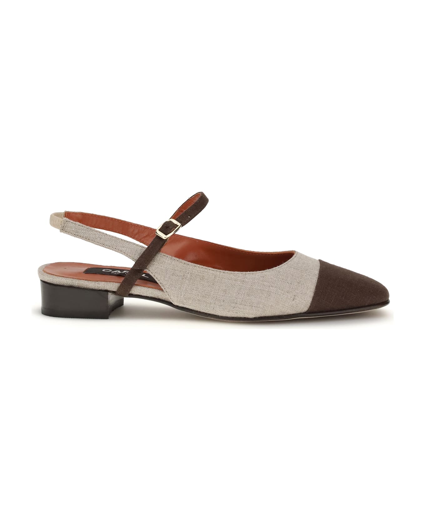 The oceano ballerinas by carel paris are a slingback style with a straight toe that is elegant and refined. the adjustable strap at the top wraps the foot in style, while the leather sole is complemented by a non-slip rubber cushion customized with carel's iconic canework for flexibility and comfort. the canvas design lends lightness and a contemporary feel to the shoe.