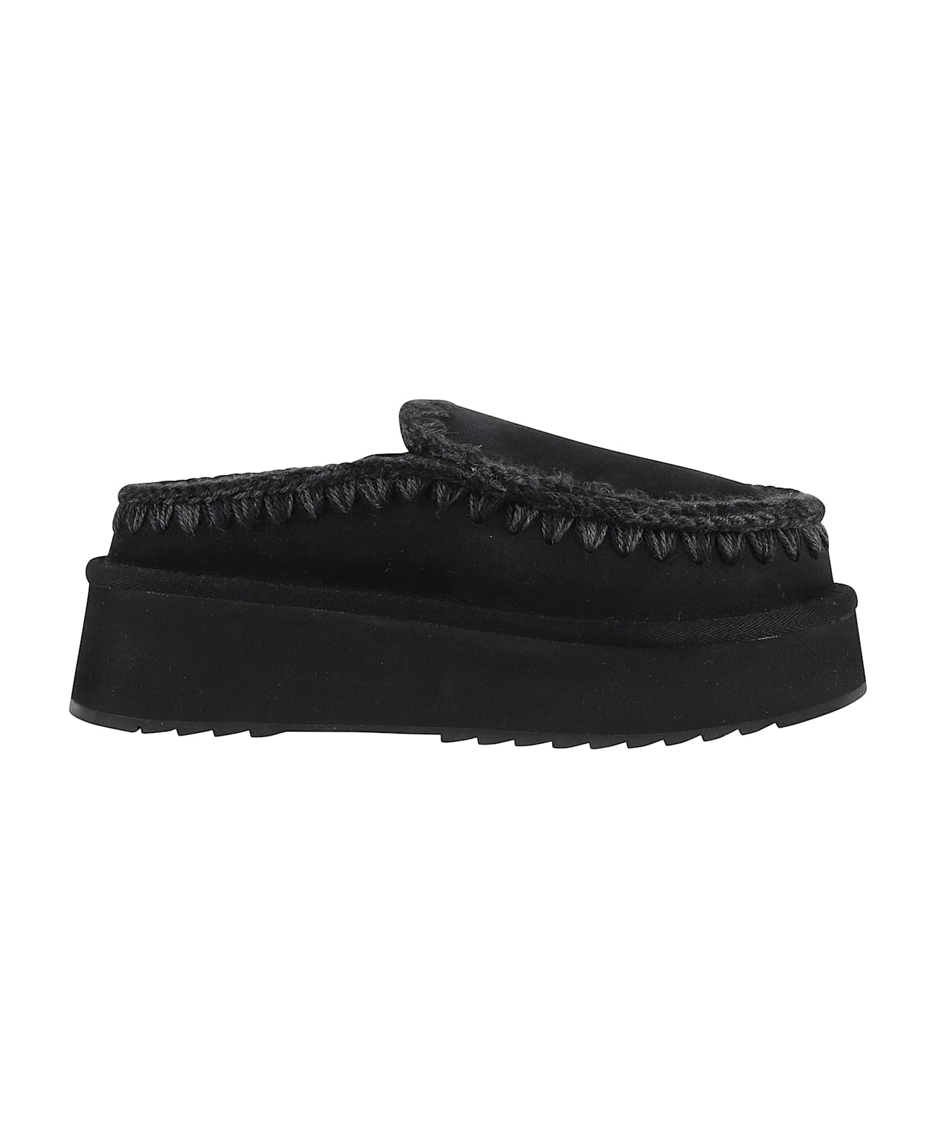 Eskimo Platform clogs - Mou - Black color - Suede leather upper - Fur lining - Stitched crochet detail - Slip-on model - Platform height 5 cm - Rubber sole
