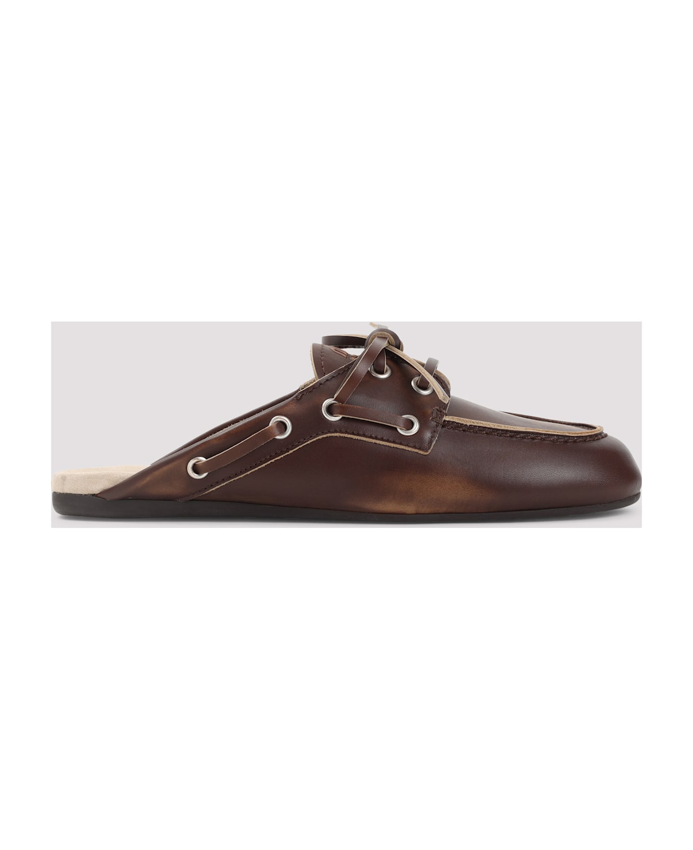 Miu Miu Burned Brown Calf Leather Mules. Pure burned brown calf leather mules, round toe, top lace-up fastening, slip-on style, flat design, black sole, mule design.
