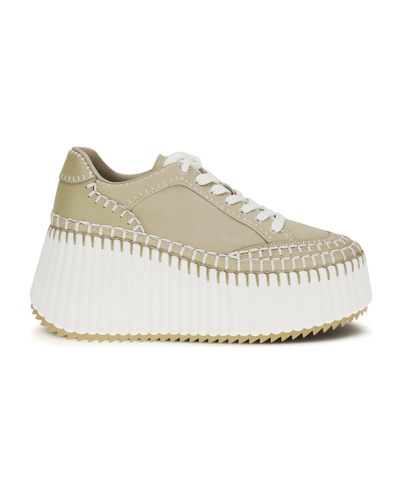 The nama wedge sneakers by chloé reinterpret the iconic nama design with a bold wedge silhouette. crafted from beige canvas with a recycled sole, they stand out for their eco-designed construction and hand-stitched upper, highlighting the model s artisanal character. the tonal leather heel counter adds structure and support, while the lace-up closure ensures a secure and comfortable fit. lightweight and ultra-comfortable, they feature a round toe and fabric lining, making them ideal for everyday wear with a refined casual style.