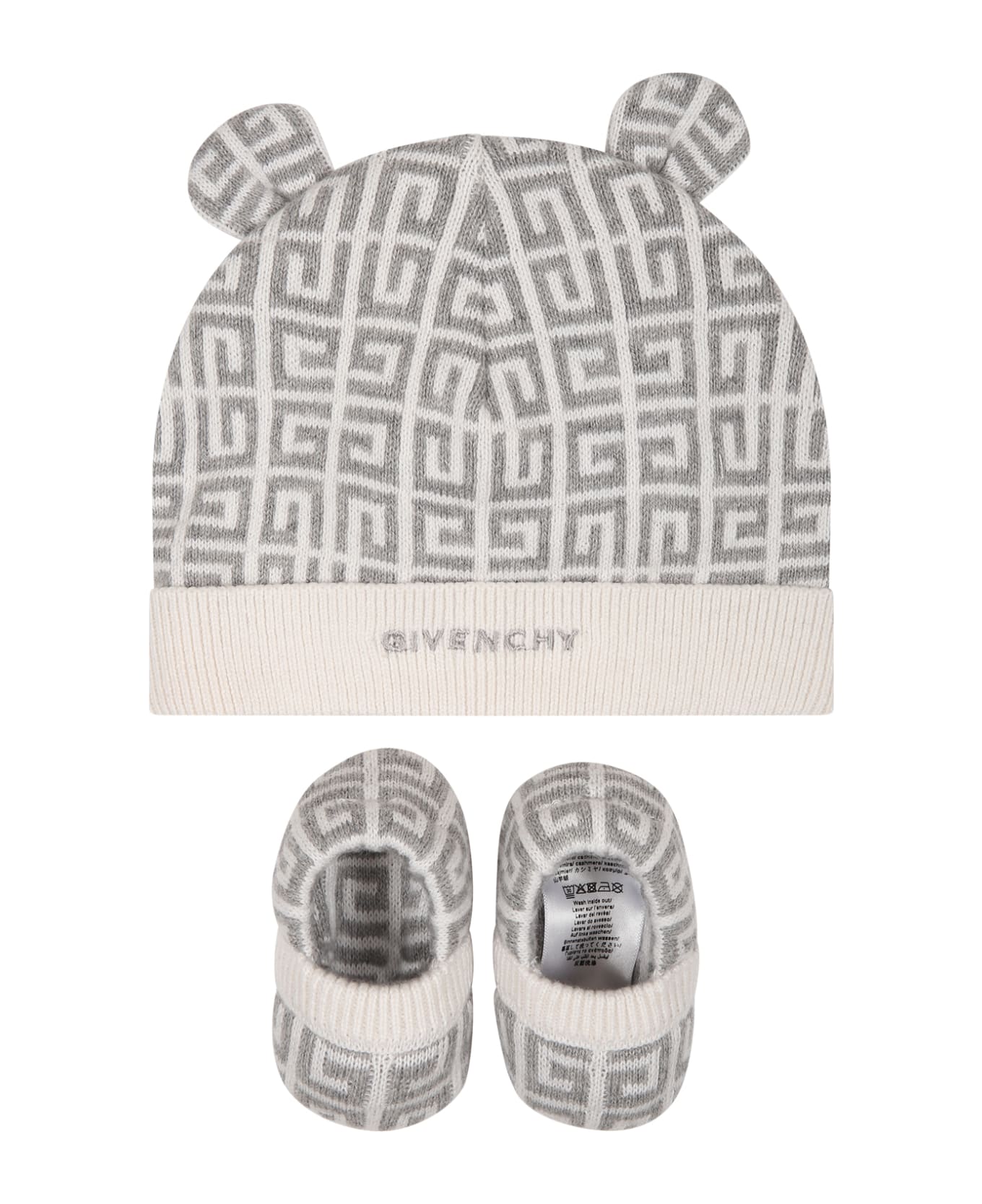 Color: Grey Grey set in cotton and cashmere, composed of hat and slippers. Hat with ribbed cuff and ears applied on the sides. It is embellished with embroidered logo on the front and all-over iconic 4G pattern. Booties with elasticated back. They are embellished with an all-over 4G motif. 95% Cotton, 5% Cashmere. Machine wash at 30C.