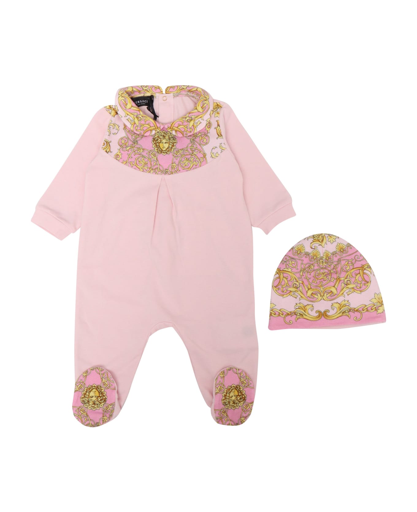 Stretch cotton set, onesie with peter pan collar and feet, Baroque print beanie Composition: 6% ELASTANE 94% COTTON FABRIC 2 6% ELASTANE 94% COTTON