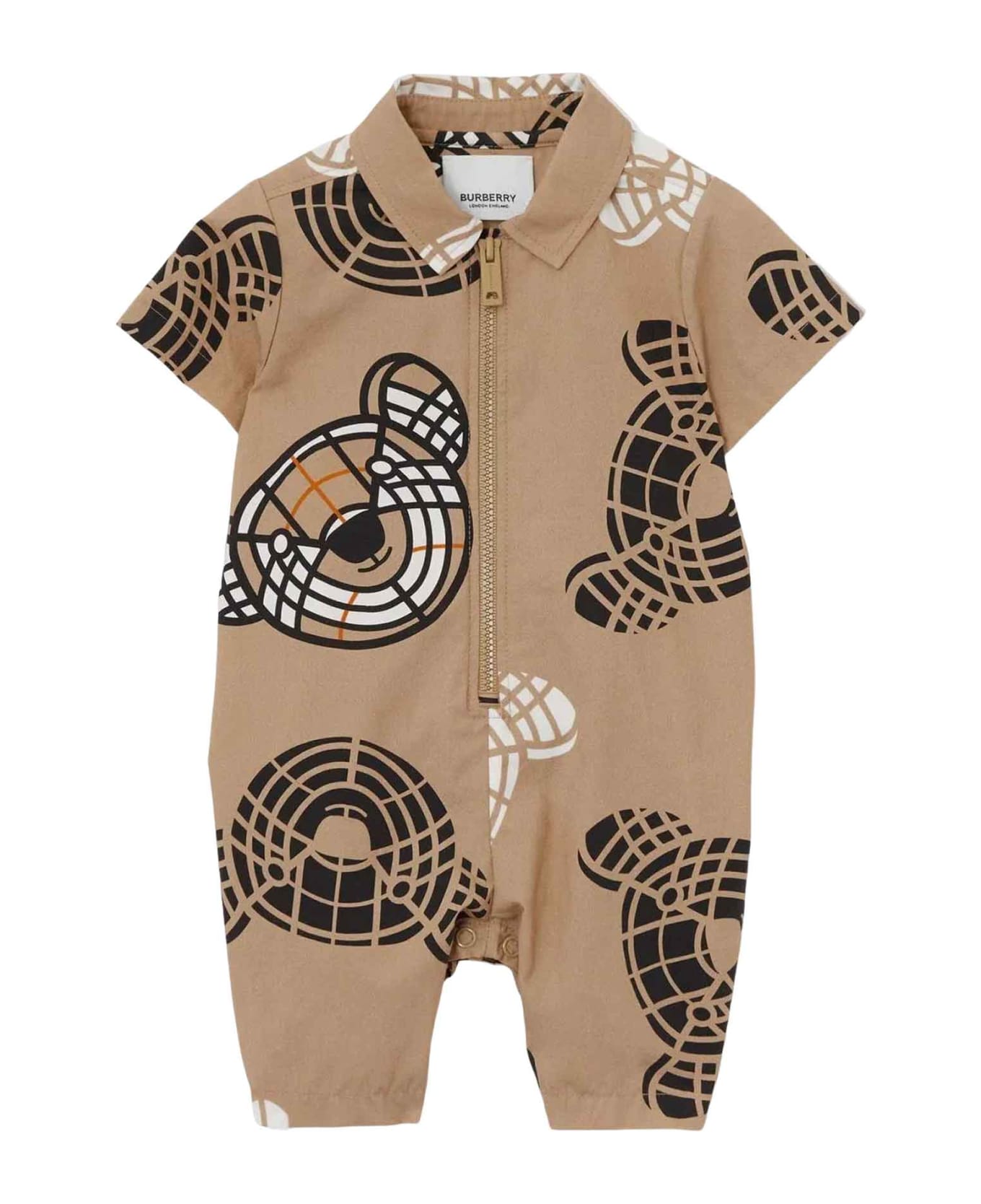 Beige romper baby unisex. Bear print, classic collar, front zip closure, short sleeves and straight cut. 100% Cotton