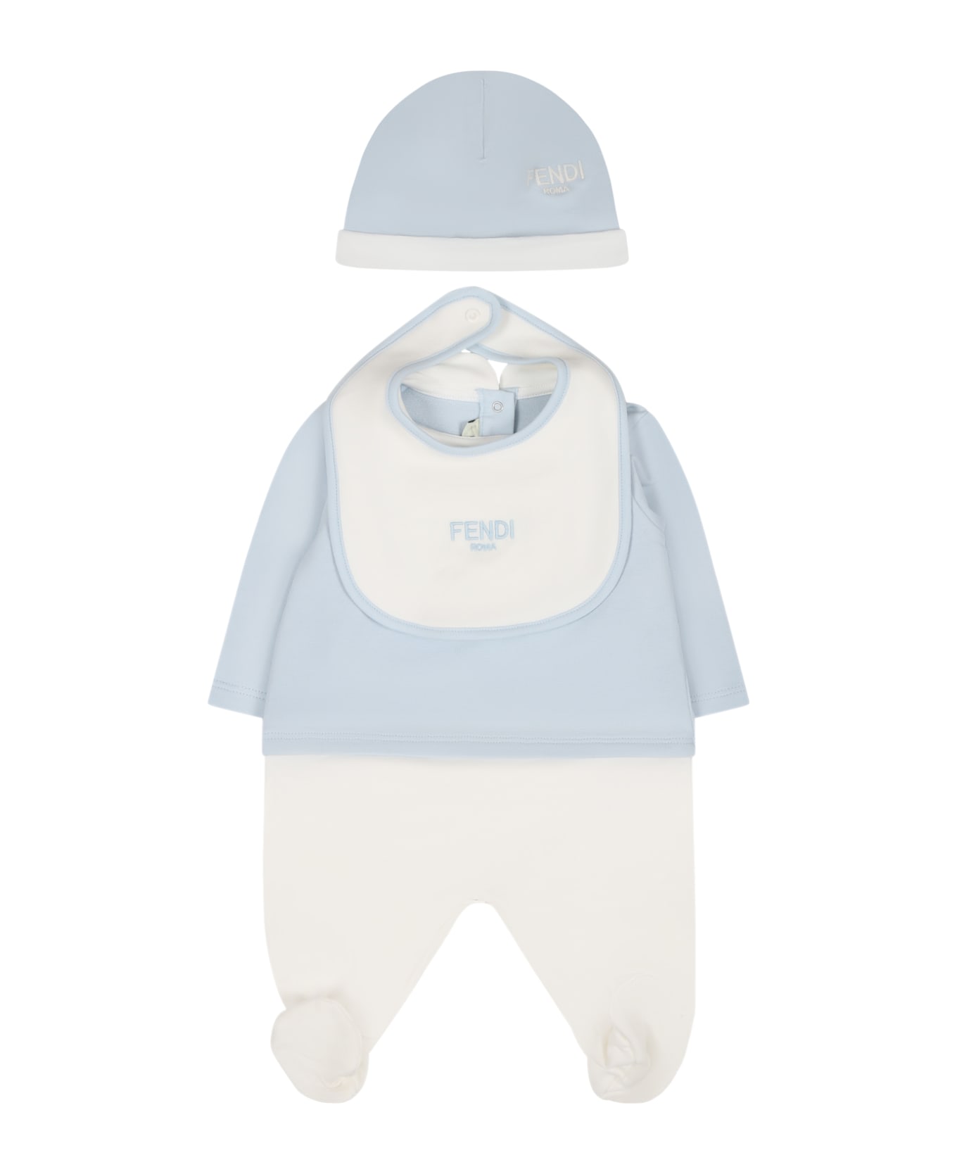 Multicolor set composed of onesie, hat and bib. Light blue cotton onesie, white classic collar, long sleeves, feet and snap button closure on the back and between the legs; it is embellished with white logo on the previous part. Light blue cotton hat with white turn-up, embellished with white logo embroidered on the front. White bib in cotton with automatic button closure on the back; it is embellished with light blue profile and light blue logo embroided on the former part.