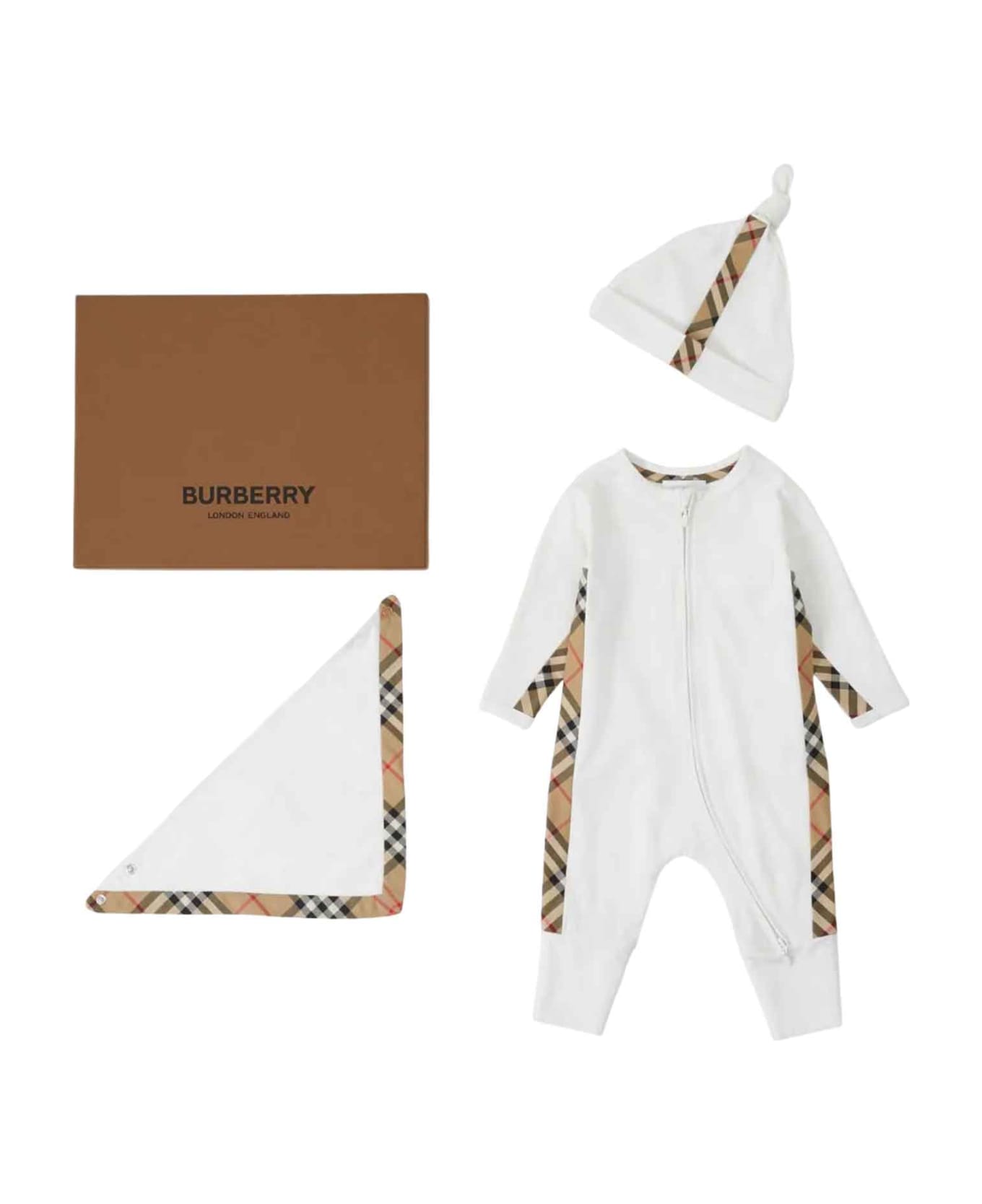 White/beige set baby unisex. Check pattern, off-centre front zip closure, long sleeves, logo patch on the chest, ribbed cuffs and hem. Cotton 94% Spandex/Elastane 6%