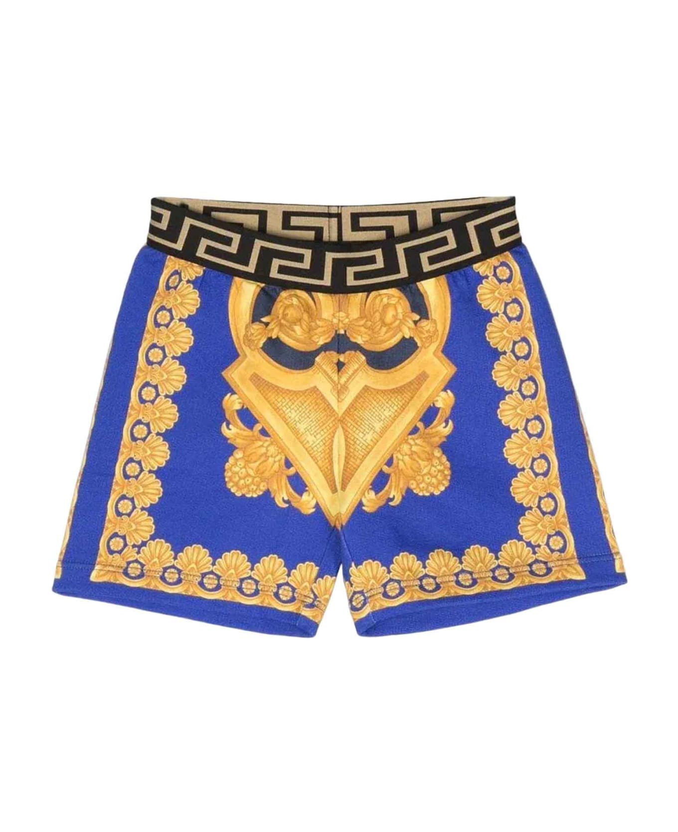 Blue shorts unisex kids. Stretch design, gold details, Barocco print, logo on the waist and thigh length. Cotton 100%, Polyester 82%, Spandex/Elastane 9%, Polyamide 9%