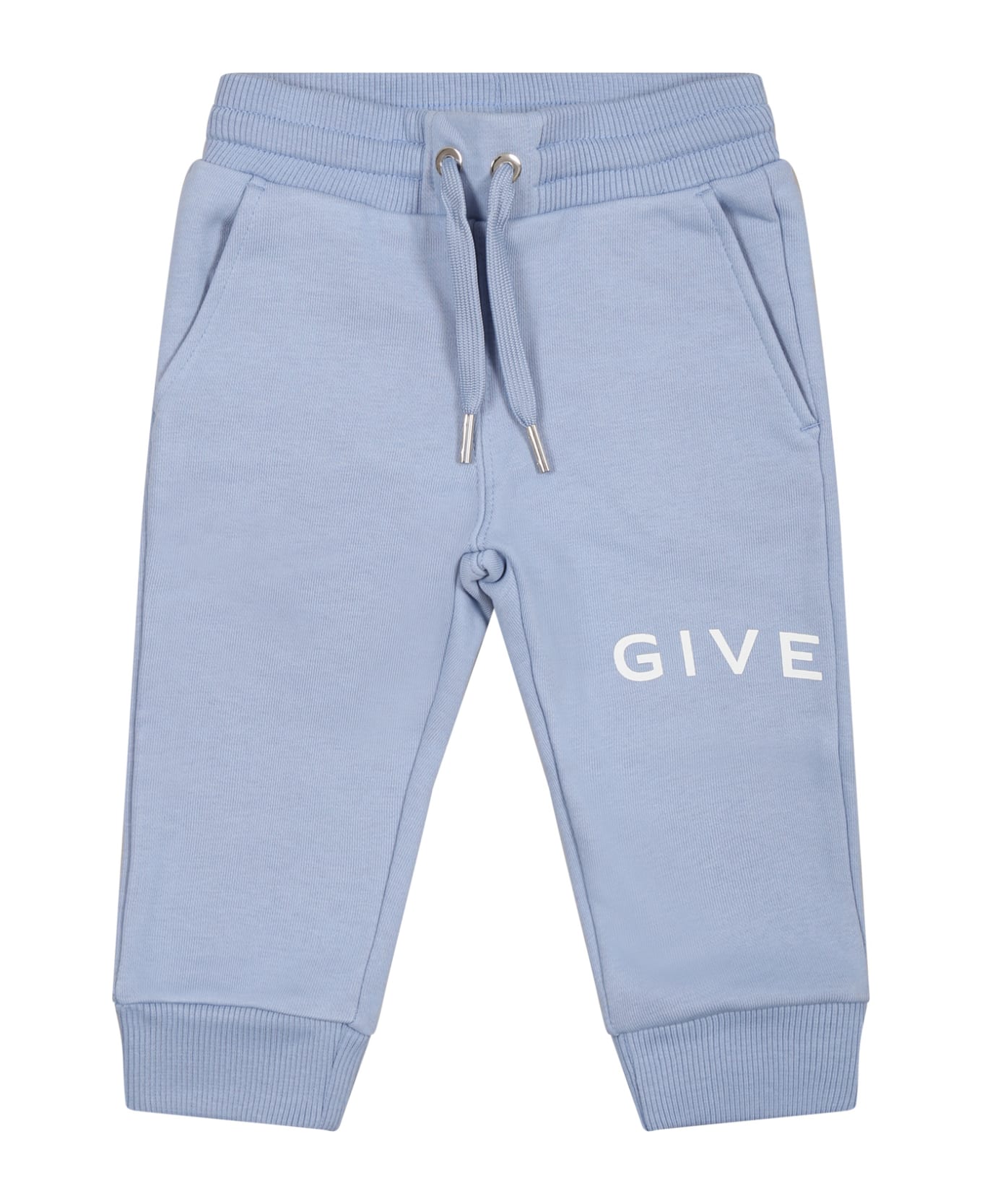 Light blue trousers, in brushed cotton , with elastic waistband and drawstring, side pockets and one back. They are embellished with monogam on the back and logo on the front and back.