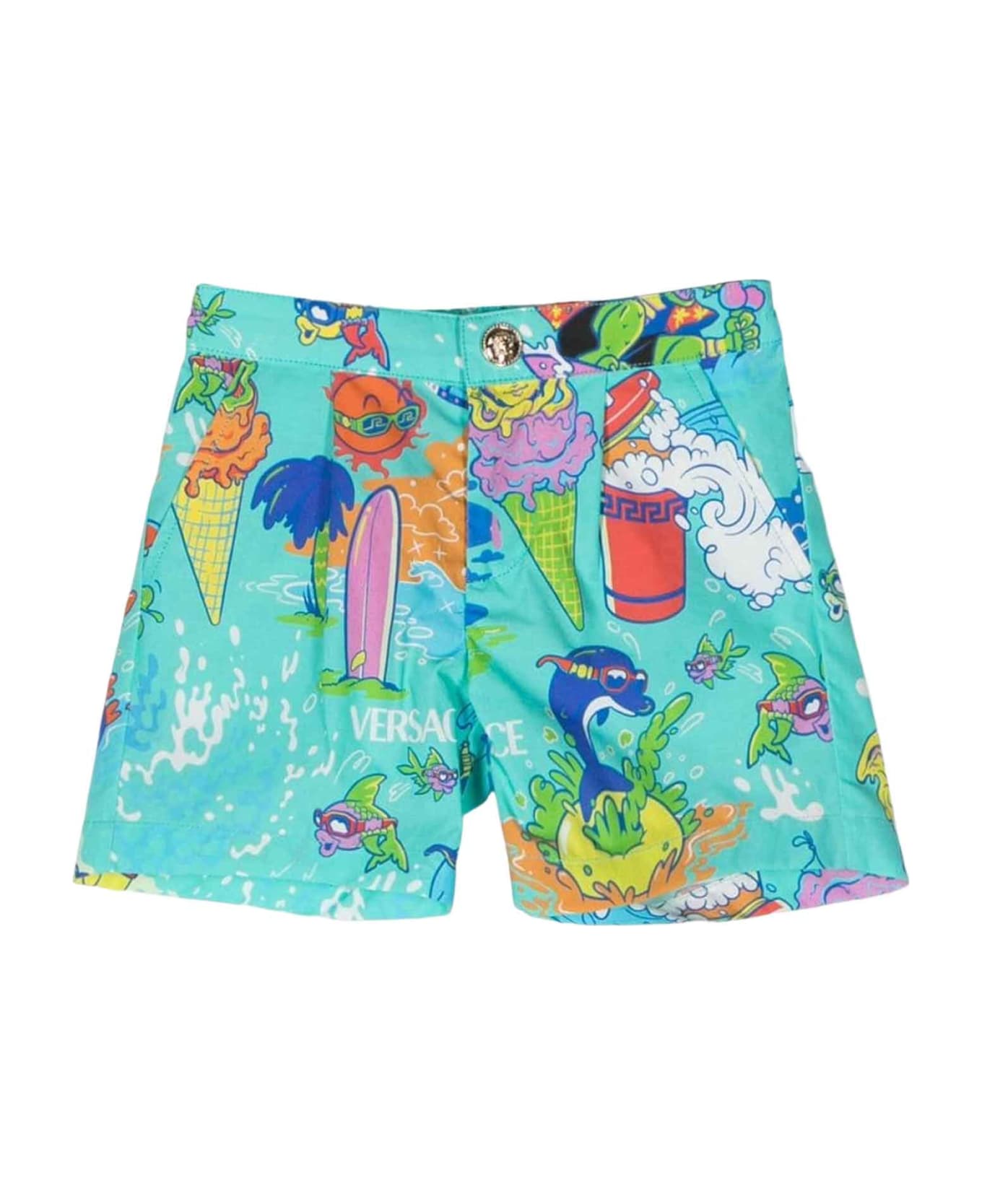 Multicolor shorts unisex kids. Logo print on the leg, all-over graphic print, buttons with engraved logo, elasticated waist on the back and straight hem. 100% Cotton