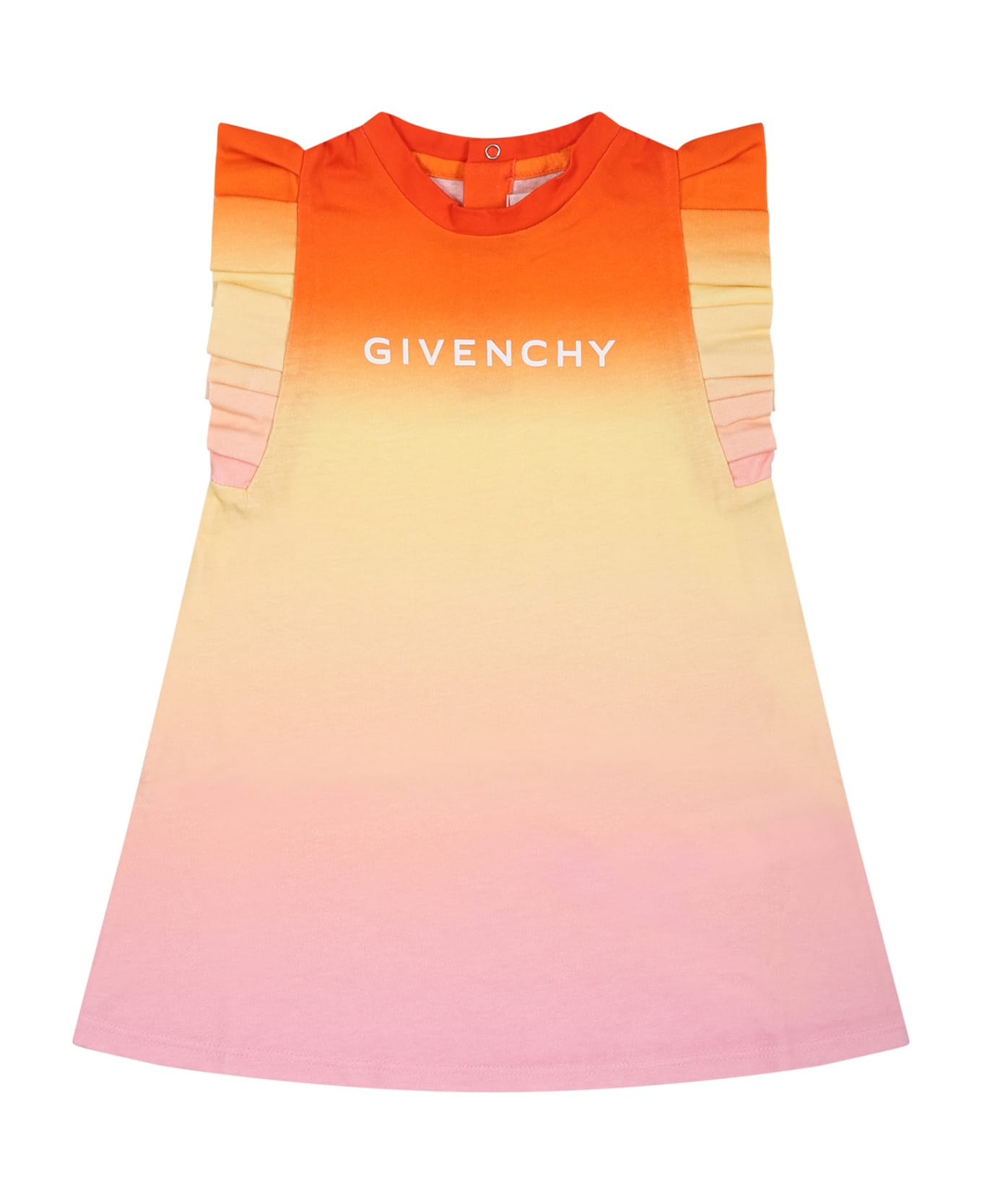Multicolor dress, in cotton, sleeveless, ribbed round neck, snap button closure on the back wall. He is embellished with ruffles on the shoulders and white logo on the front.